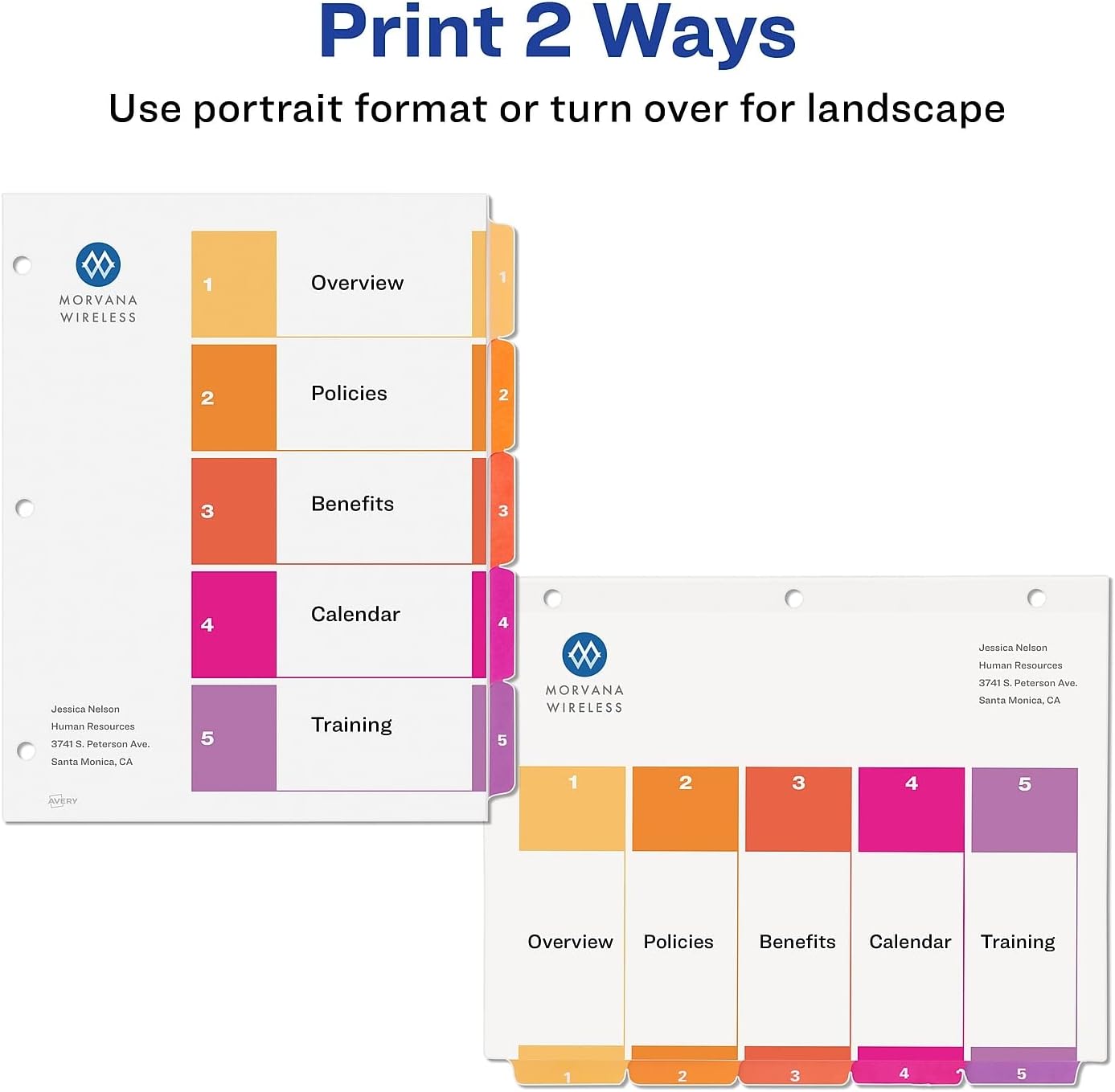 - Multicolor divider tabs are preprinted and don't require labels or inserts