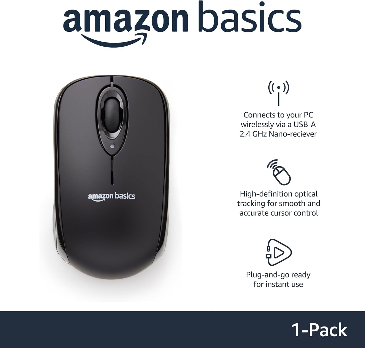 Amazon Basics 2.4 Ghz Wireless Optical Computer Mouse with USB Nano Receiver, Black