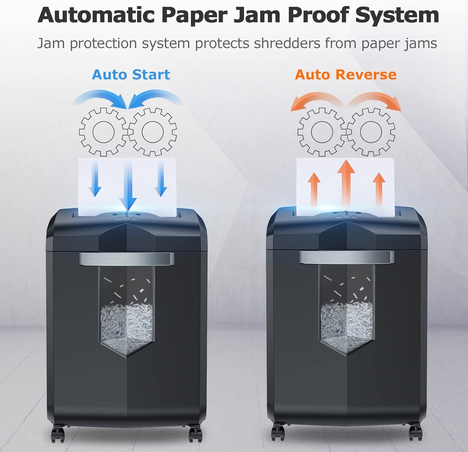 - Auto Start & Reverse: Auto start/stop and auto-reverse function protect you from the frustration of paper jams; overheating and overloading protection technology keeps sustainable using and prolong shredder's use time. Press the power switch, you only need to put the paper into the entrance of the shredders for home office and it will work automatically