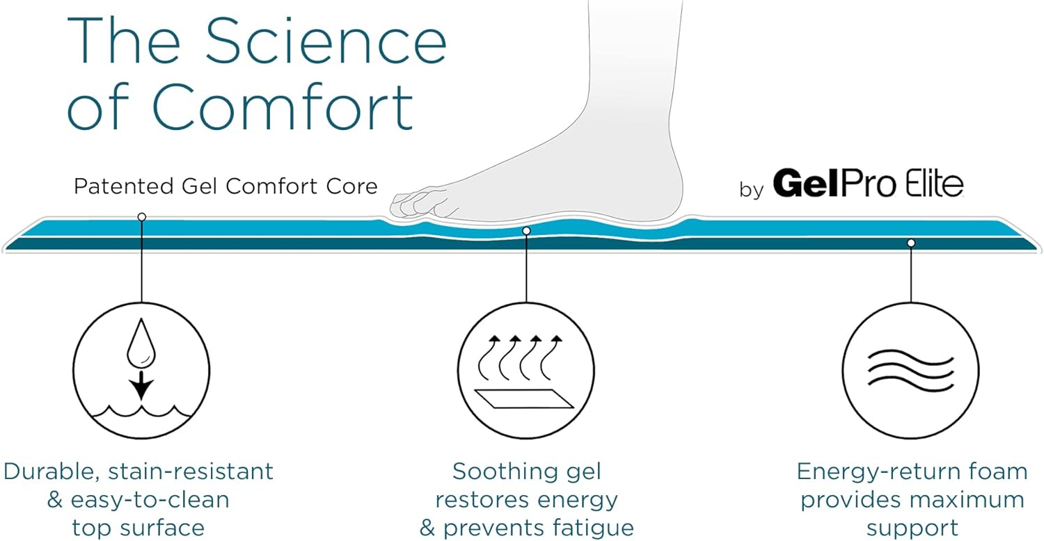 - PATENTED GEL TECHNOLOGY! GelPro Elite features a ¾” core of soothing gel + energy-return foam which dramatically reduces stress, fatigue & discomfort while standing.