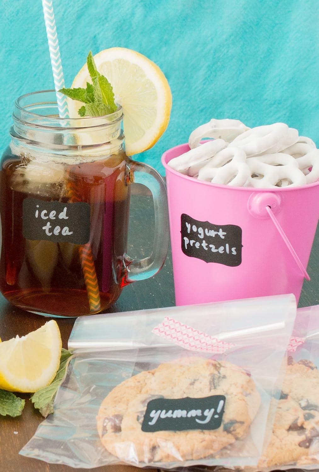 - 👍 MORE CHALKBOARD STICKERS IN THIS SET Your set has a bundle of 90 mini fancy chalk board labels, 1" x 1.75", great for organizing, labeling spice jars, bottles of essential oils , wine glasses, and file drawers, AND a resealable storage bag ; the adhesive on these small labels sticks well to all surfaces. These chalkboard stickers are perfect for mason jar labels, pantry organization, spice jar labels, labels for food containers, wine labels for bottles, freezer labels, or herb markers.