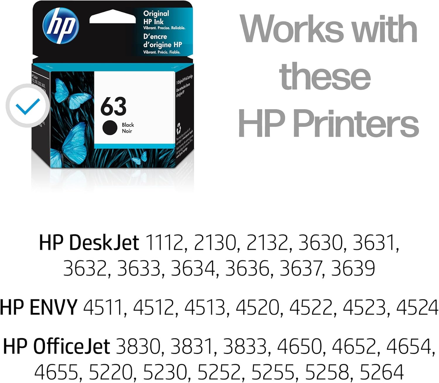 HP 63 Black Ink Cartridge for HP Printers | Works with Printer Series: DeskJet 1112, 2130, 3630; ENVY 4510, 4520; OfficeJet 3830, 4650, 5200 | Eligible for Instant Ink | F6U62AN