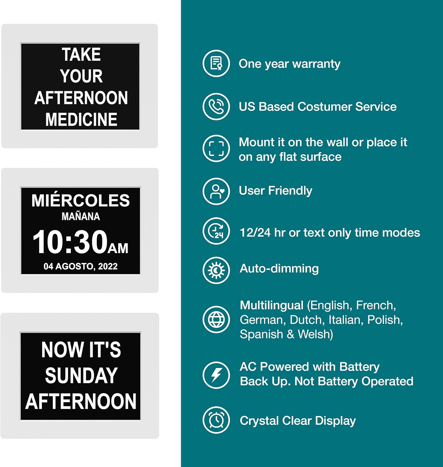 - Multi-language support: The large display digital clock for seniors supports multiple languages and offers different time formats, making it accessible to individuals who speak different languages.
