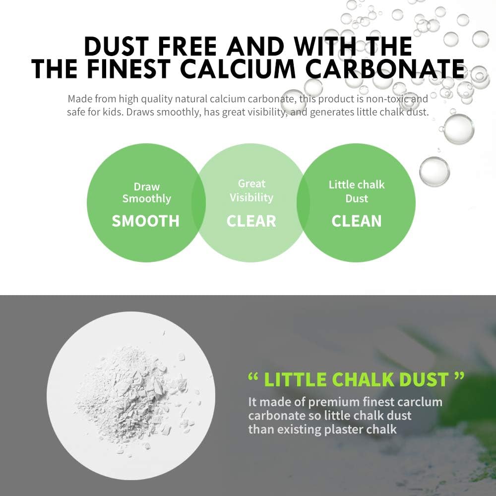 - NO MISTAKES: Our chalks erase easily leaving little to no residue on the chalkboard when removed. Chalk can be easily washed from most articles of clothing without leaving any unwanted permanent marks. Chalk generates little dust and fallout minimizing chances of smudging and messes when writing or drawing