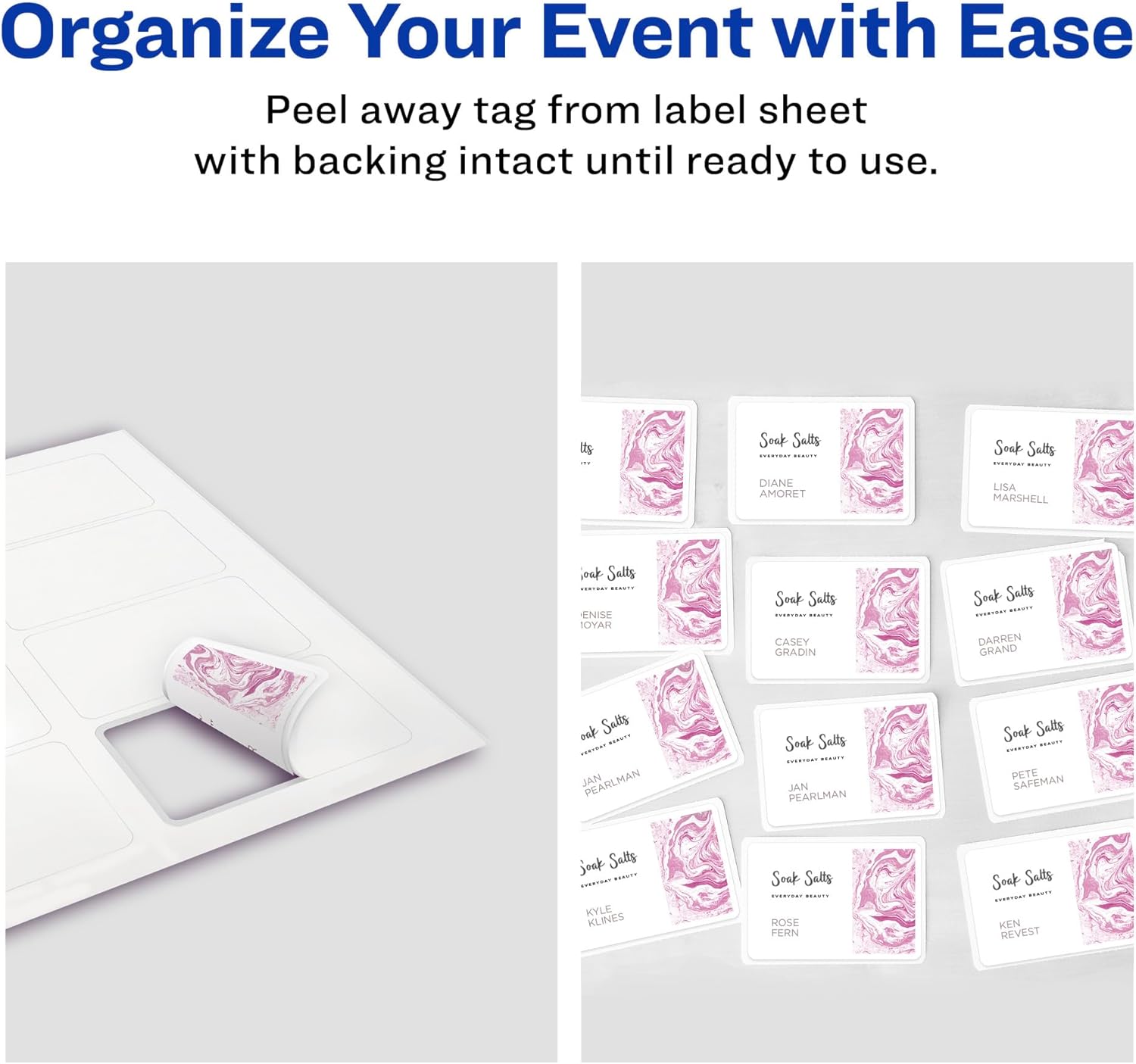 - Save time before your event with the unique peel-away design that allows you to separate each name badge from the printed sheet with the label backing still intact until ready to use