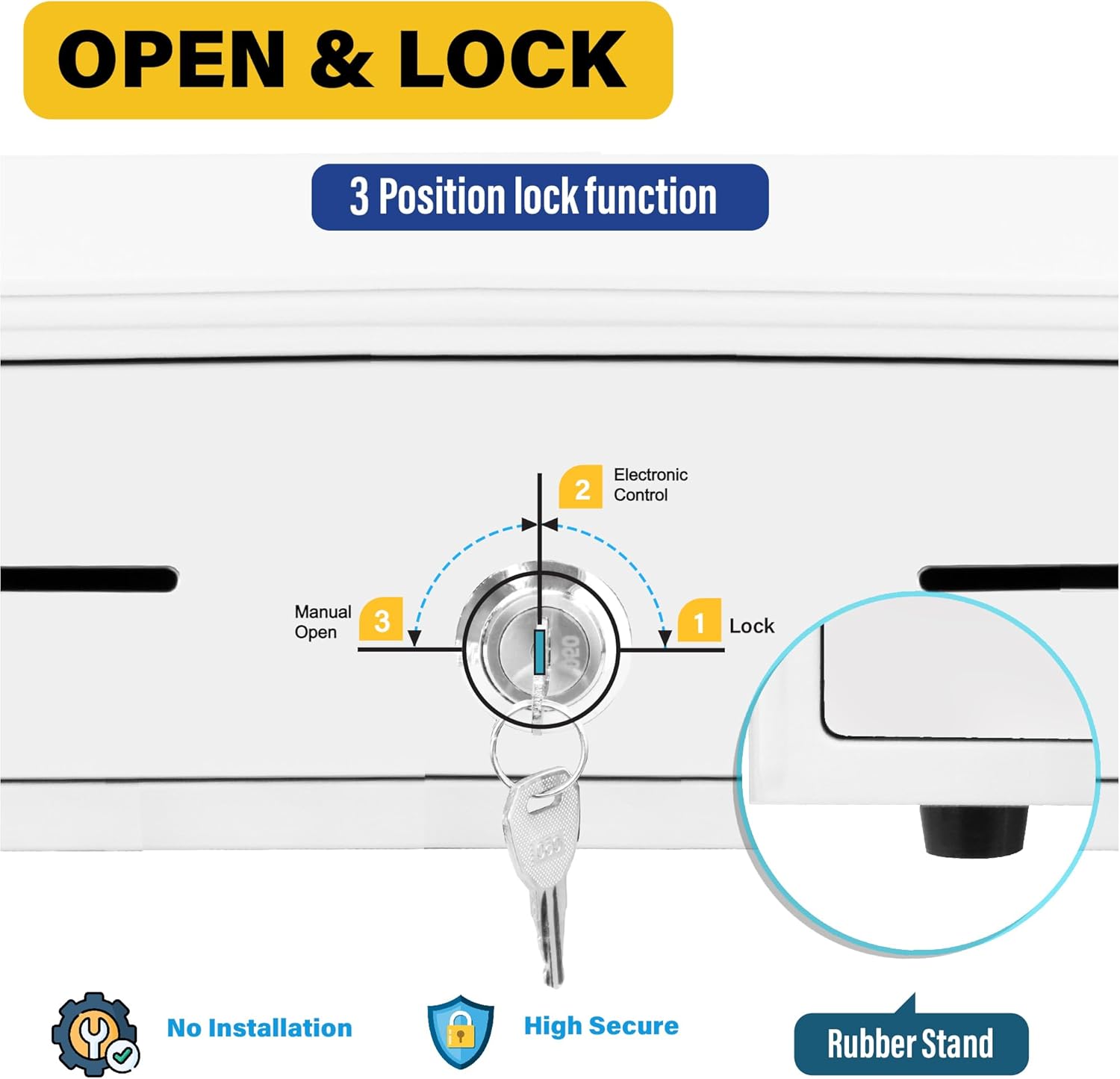 - 💳3-Position Lock& Single Large Front Media Slot: This cash drawer ensures the highest level of security with a 3-position lock mechanism: 1-Lock, 2-Auto Open by Printer/POS, 3-Manual open