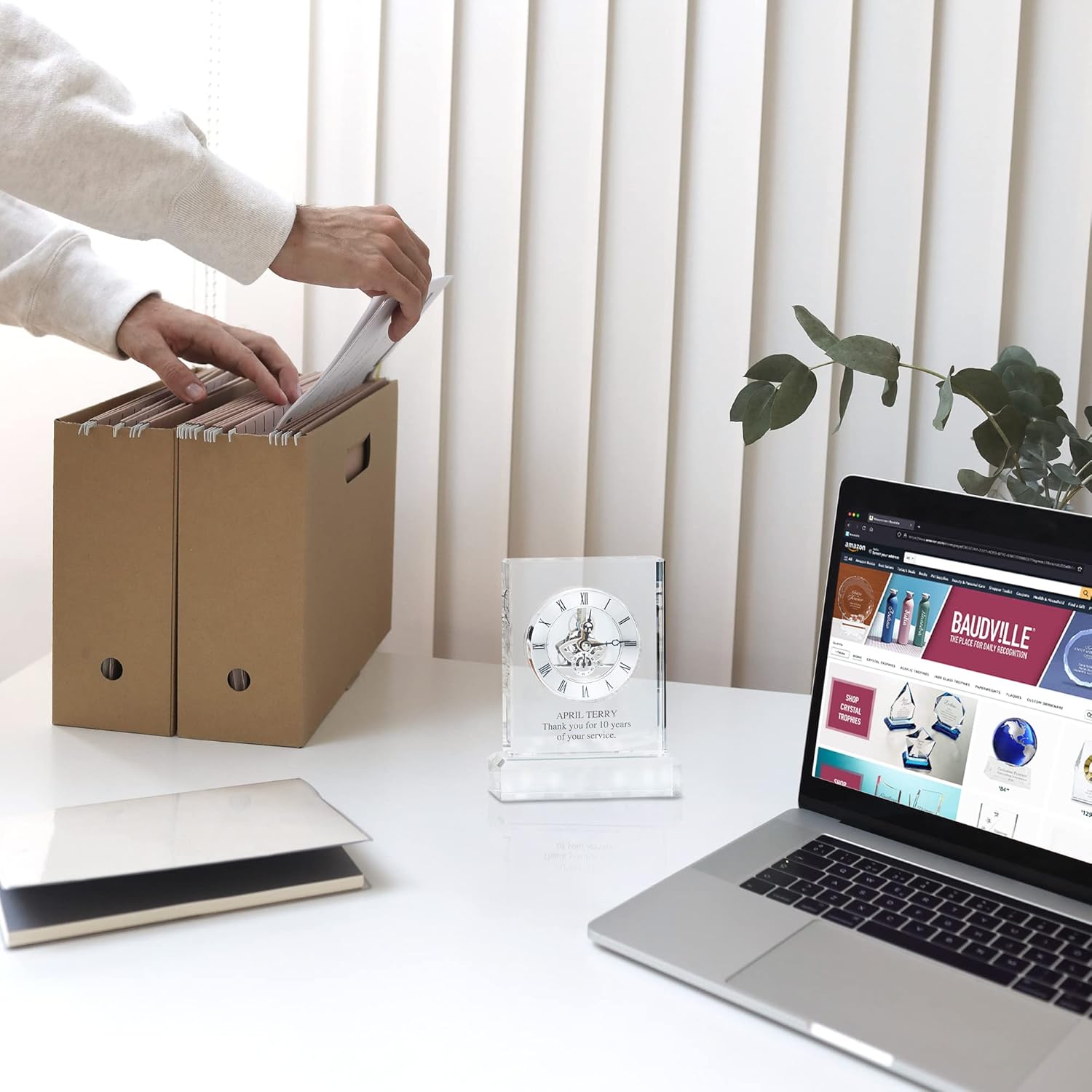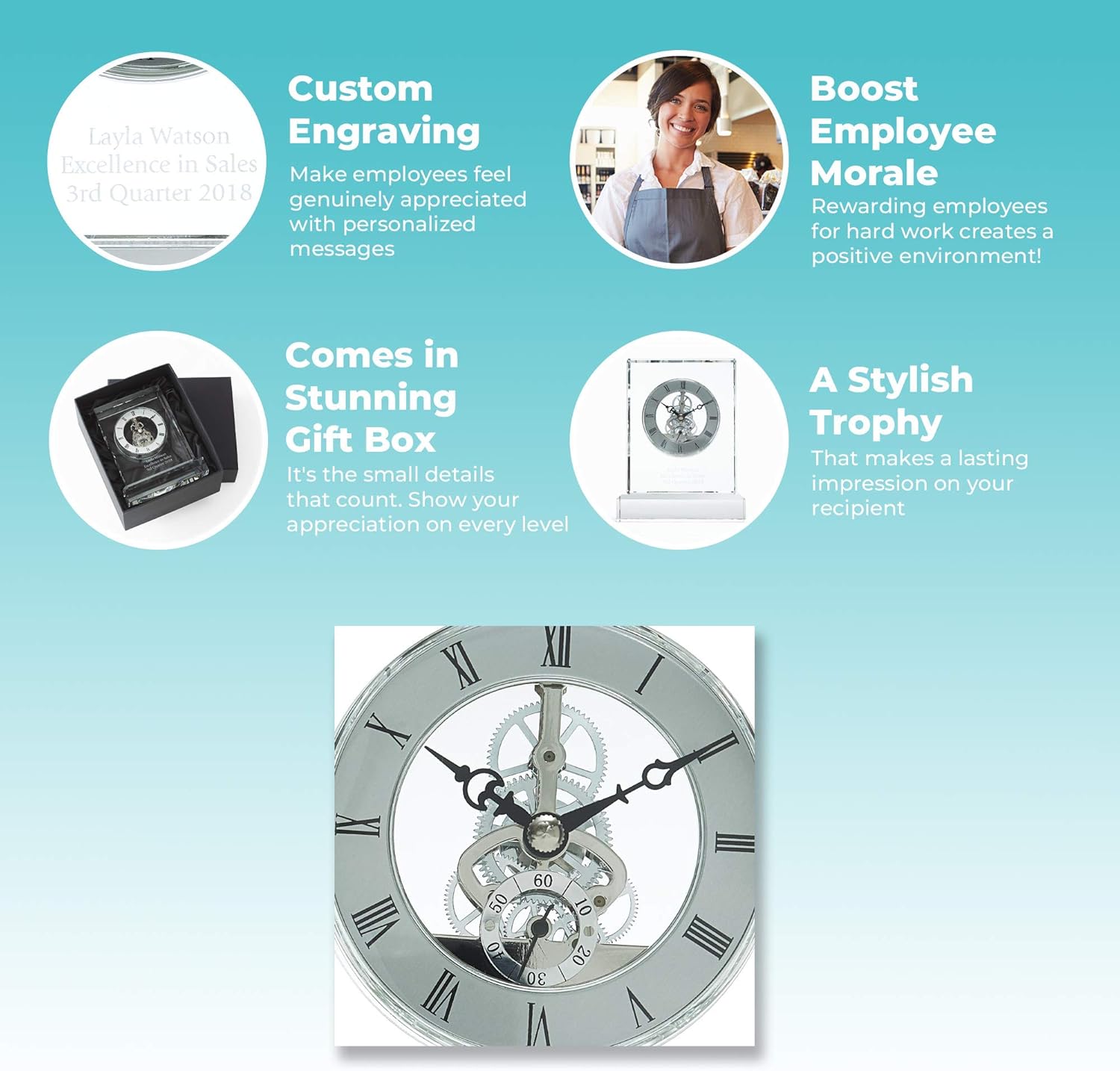 - PERSONALIZED AWARDS - Create an engraved, personalized desk or shelf clock for employee recognition, for your boss, retirement, and show appreciation for your workforce's achievements in our crystal glass trophies