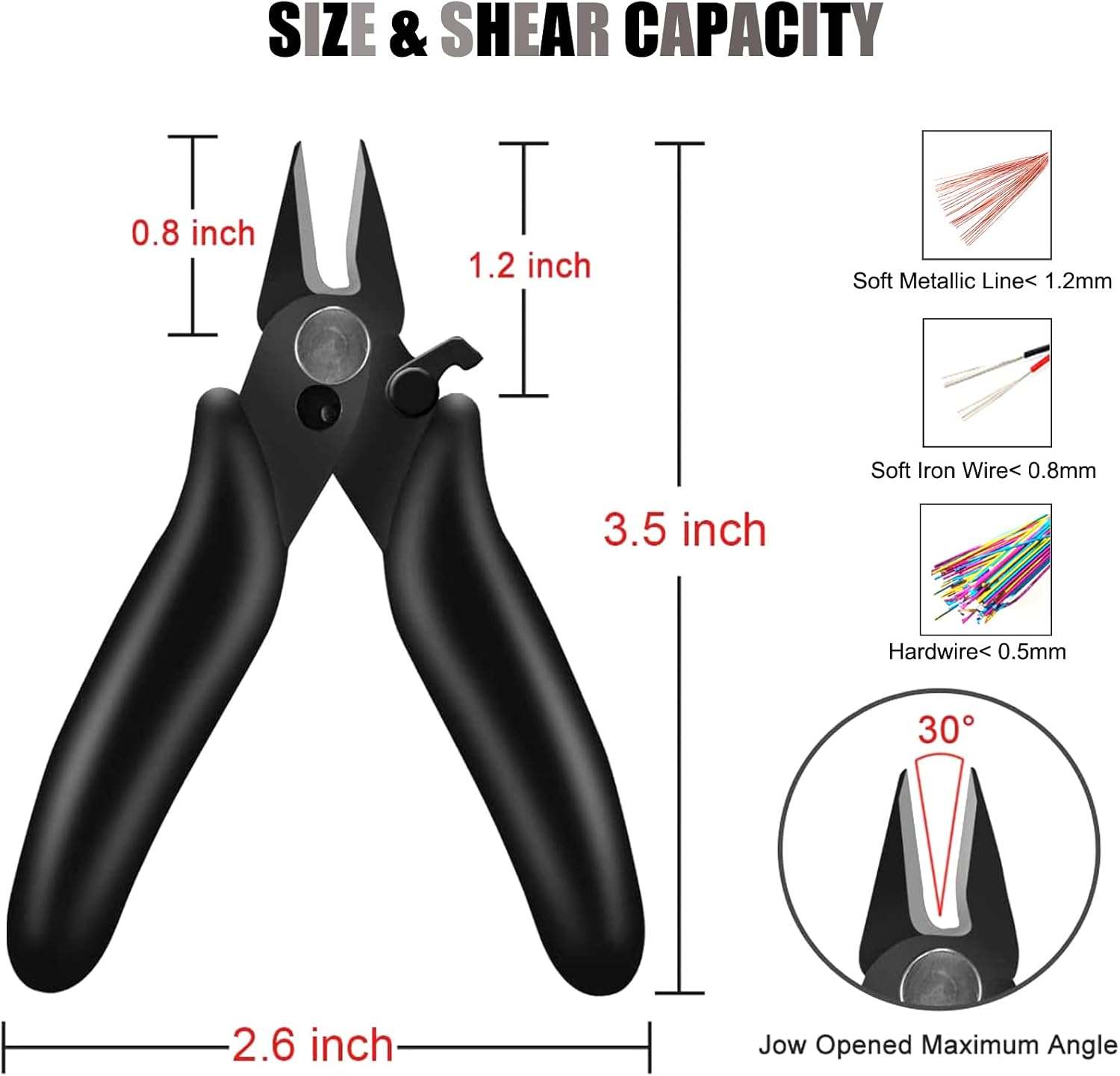- SHEAR ABILITY: The Flush Cutter has high frequency quenching flat cutting edge that sharp and durable.Can cut soft metallic line below 1.2mm,soft iron wire below 0.8mm,hardwire below 0.5mm.Do not exceed the scope of the use of pliers work. Otherwise it will damage the nippers.