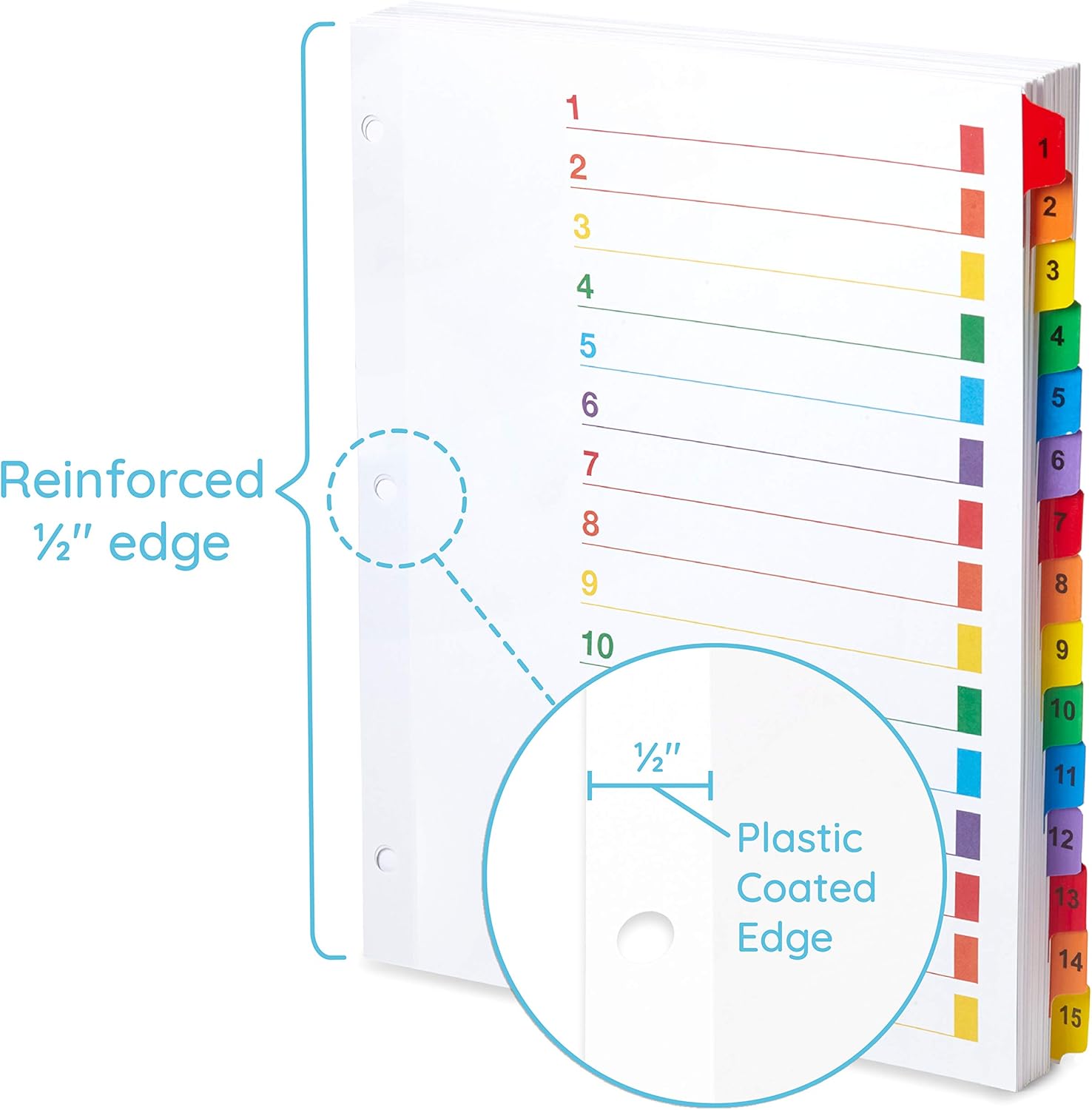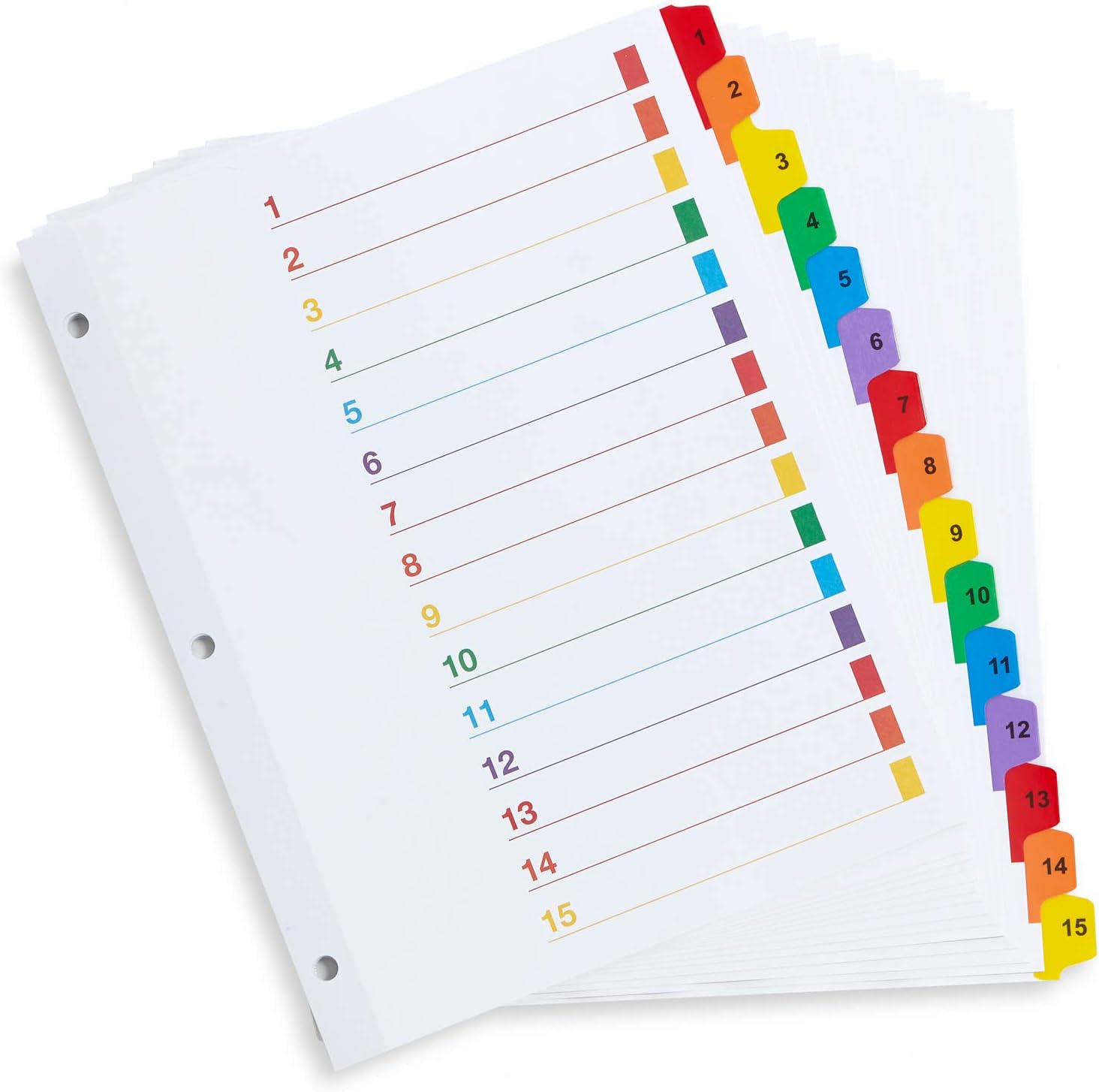 - Each binder divider features multicolored notebook tabs that are neatly pre-printed with labels from 1-15, leaving no need for annoying paper tab inserts that can fall out and get lost. The result is a neatly organized 3 ring notebook with tabs so you find what you need faster