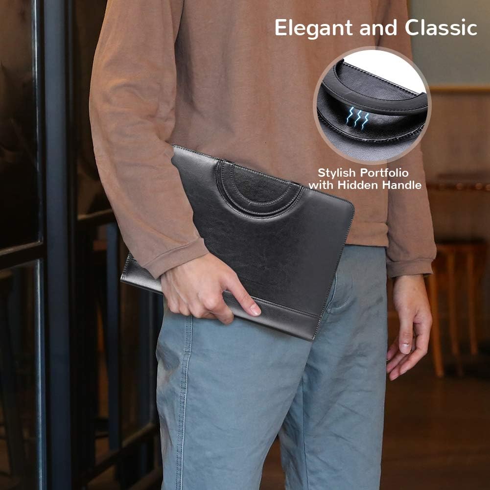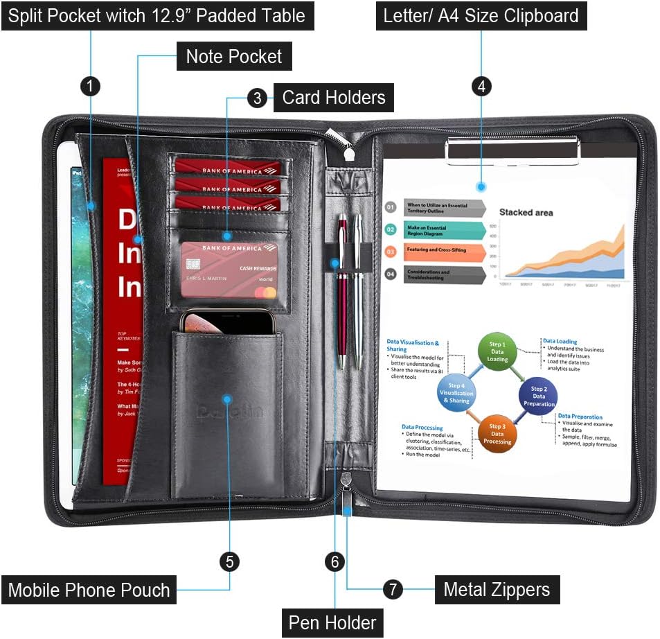 - [LARGE CAPACITY] Multiple Functions Portfolio include with a Clipboard, a Tablet Sleeve (up to 12.9-inch tablet), a Document Pocket, 5 Card Slots, a Mobile Phone Pouch with Charger Hole, and a Pencil Holder. Neat and Practical Organized All Your Stuff. This super business binder padfolio is big enough to safely store what you need yet is compact, stylish & travel-friendly.