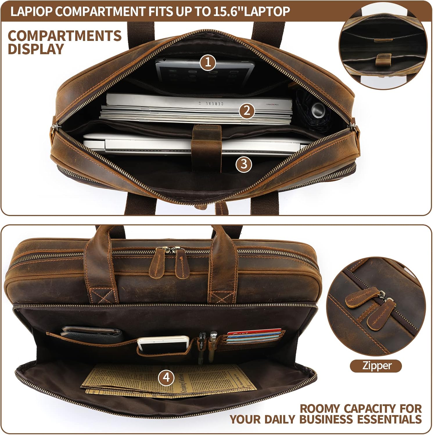 - Structure for this brown leather breifcases for mens: 1* main pocket, 1* front zippee handle of your pocket (a multi-functional storage area for A4 papers, pens, cards, key, phone, ect.), 1* inner zipper pocket, 1* 15.6 inch padded laptop compartment. There comes with leather belt on the back of this messenger bag for men that you can put it into luggage case to save your hands.