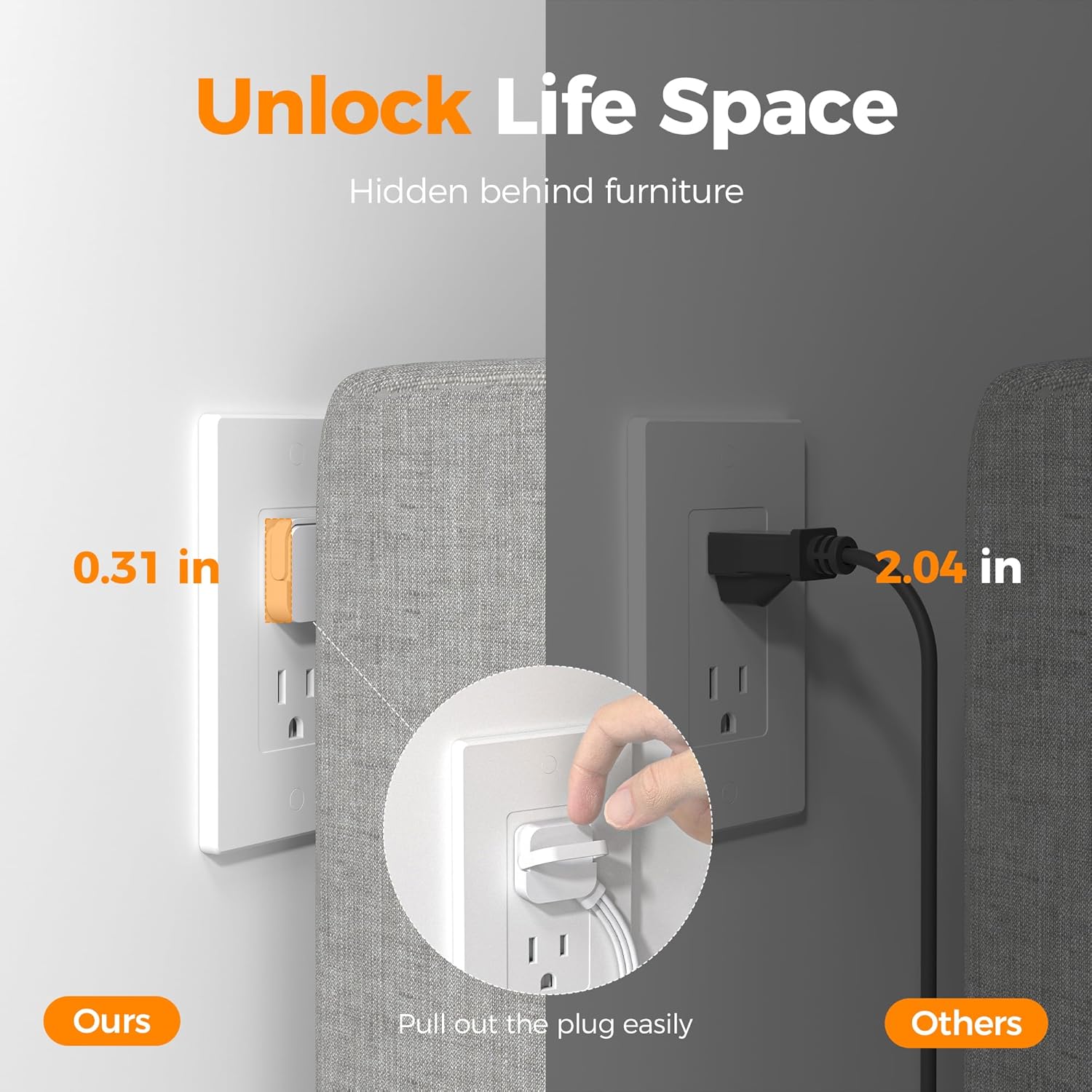 - Easily Pull Out Flat Plug: TESSAN 0.31 inches ultra thin flat head includes a built in pull ring for easy unplugging in tight spaces like behind TV or sofa; The design make this flat plug power strip inserted or removed effortless and safe