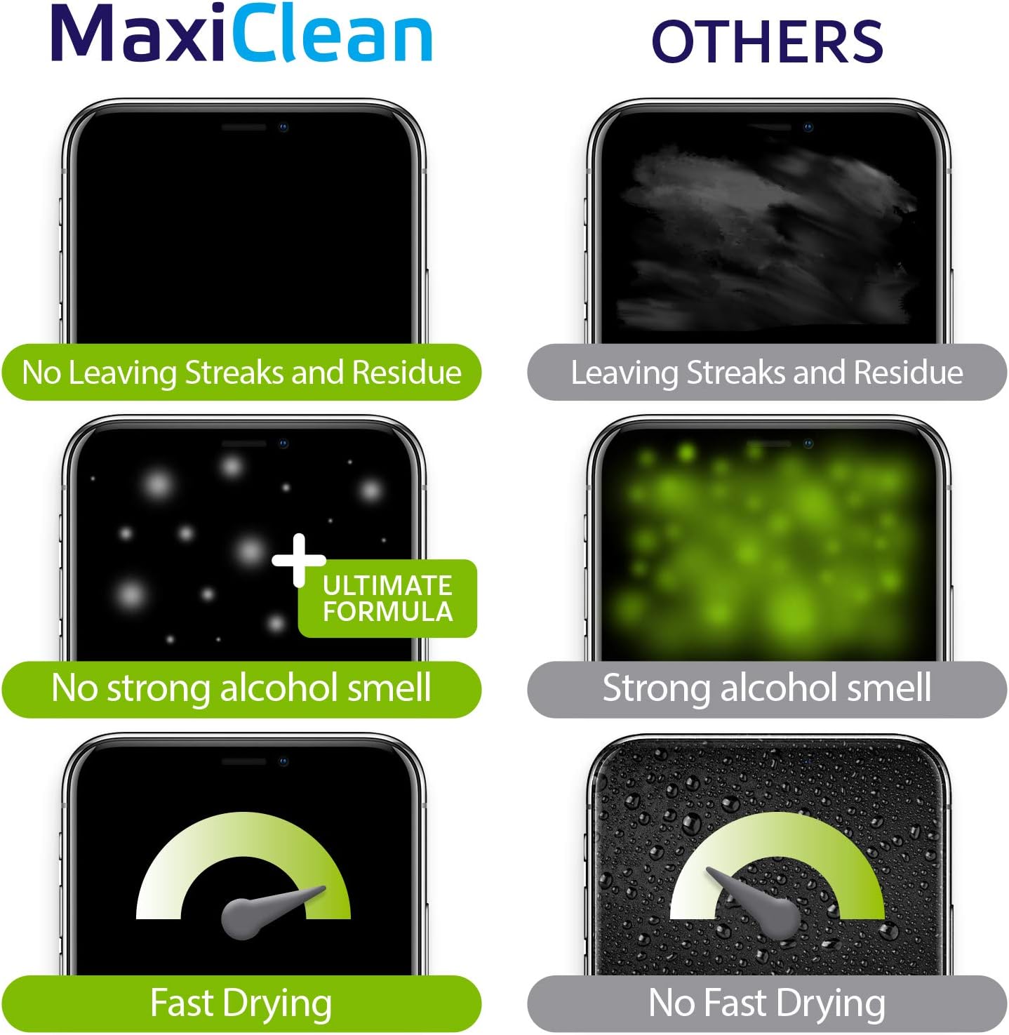 - Eco-Friendly - The innovative formula of MAXI CLEAN phone screen cleaner wipes is not only ammonia-free and without the harsh smell, but also features nonwoven material that is compostable.