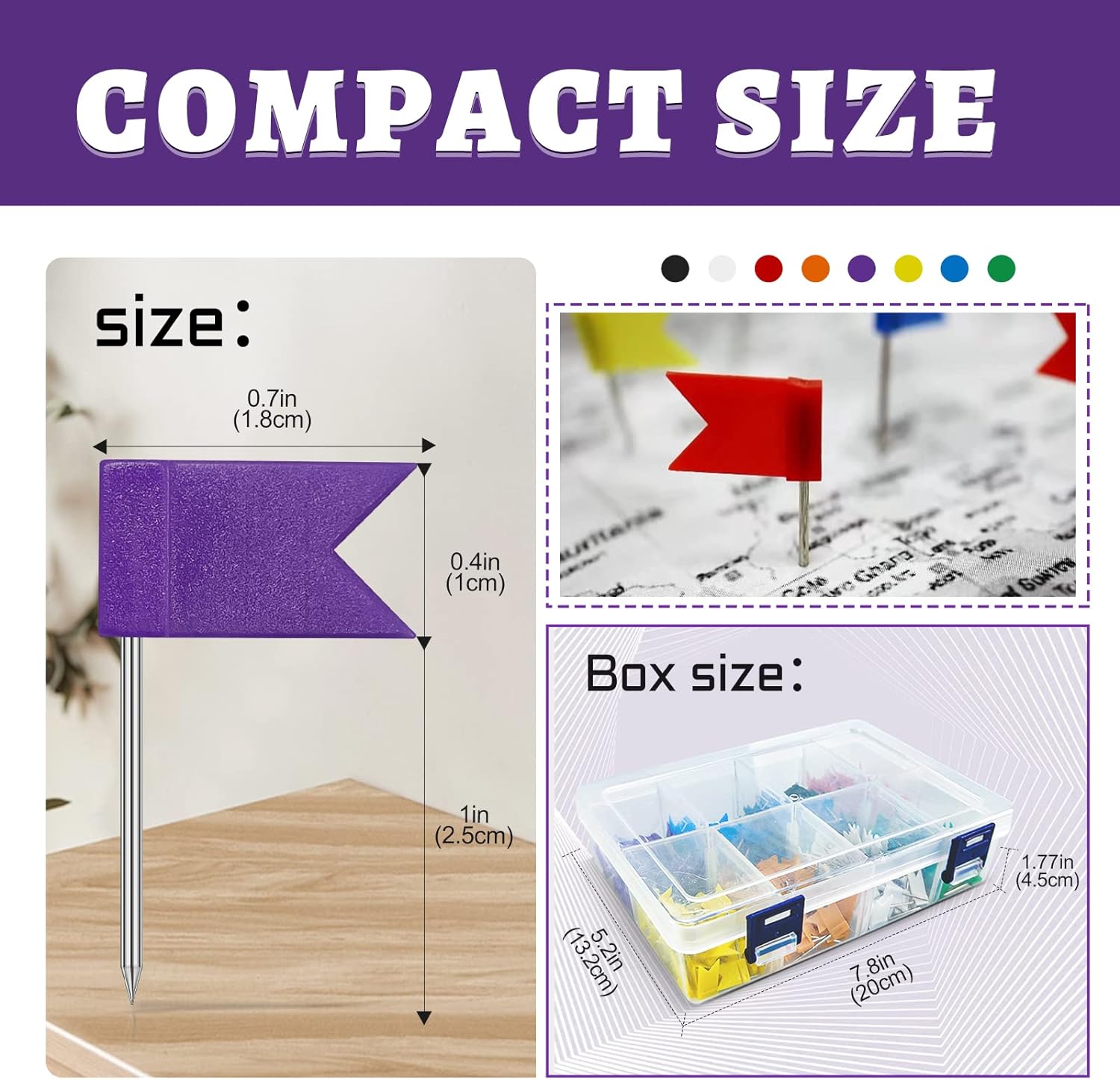 - Package Includes: 400pcs map pins, 8 colors: yellow, white, orange, green, blue, red, black and purple. 50pcs of each color are placed in a separate compartment for your convenience