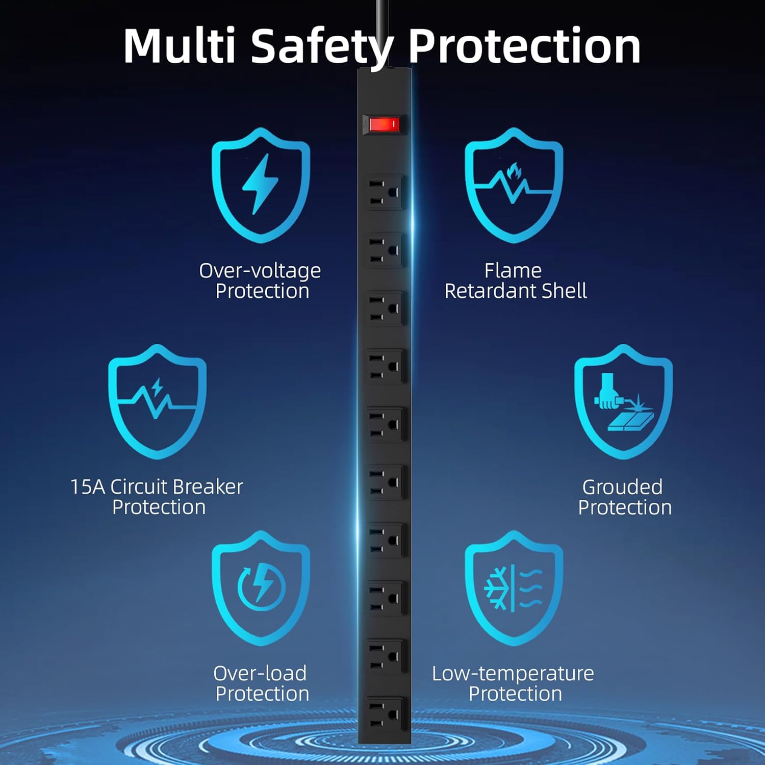 - OVERLOAD PROTECTION:A power switch with lighting has a built-in high quality 15A circuit breaker for overload protection. When the operating current exceeds the rated current, this power strip automatically cuts off the power supply from spikes, fires or other unsafe conditions.