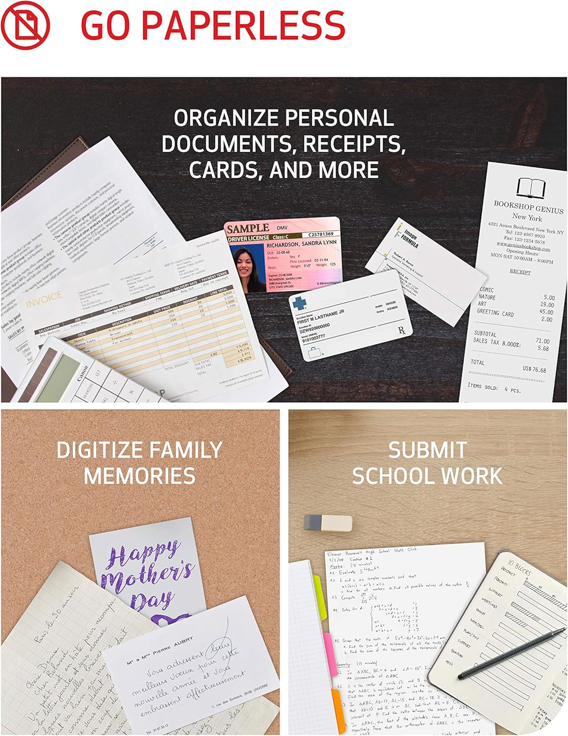 - HANDLES VARIOUS MEDIA TYPES – Digitize receipts, business cards, plastic or embossed cards, reports, legal documents, and more