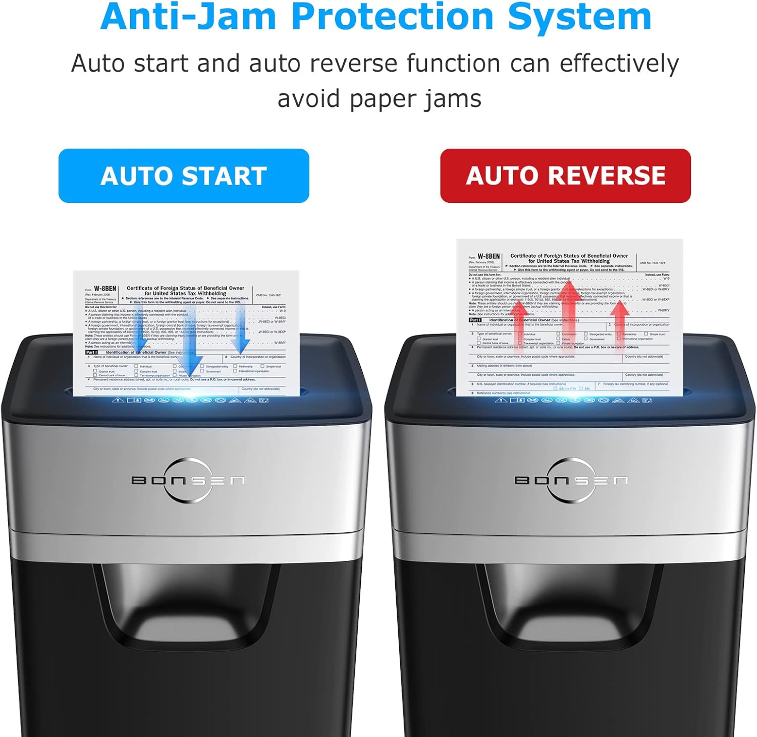 - JAM PROOF AND EASY OPERATION: The heavy duty shredder is equipped with auto start and auto reverse functions to eliminate paper jam. Easy operation with light indication, overheating and overload protection to help you use and prolong shredder's service life