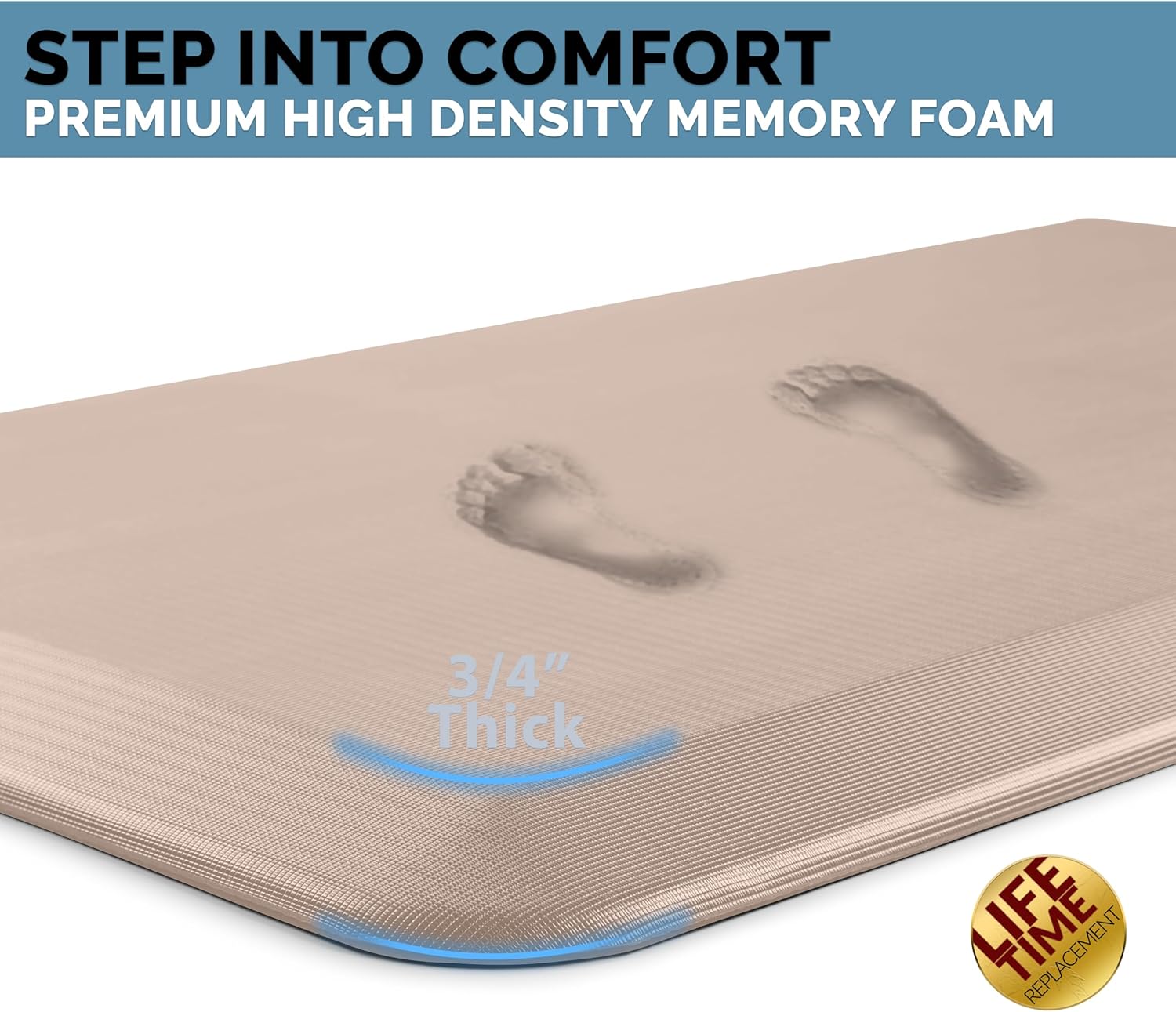 - Premium Quality Construction: The ComfiLife cushioned mat core is made of 3/4 thick, high-density memory foam that reduce discomfort on feet, knees, legs, and back while standing for an extended period. This kitchen mats cushioned anti-fatigue offers exceptional durability and long-lasting support. Perfect for high-traffic areas like the kitchen, office, or garage.
