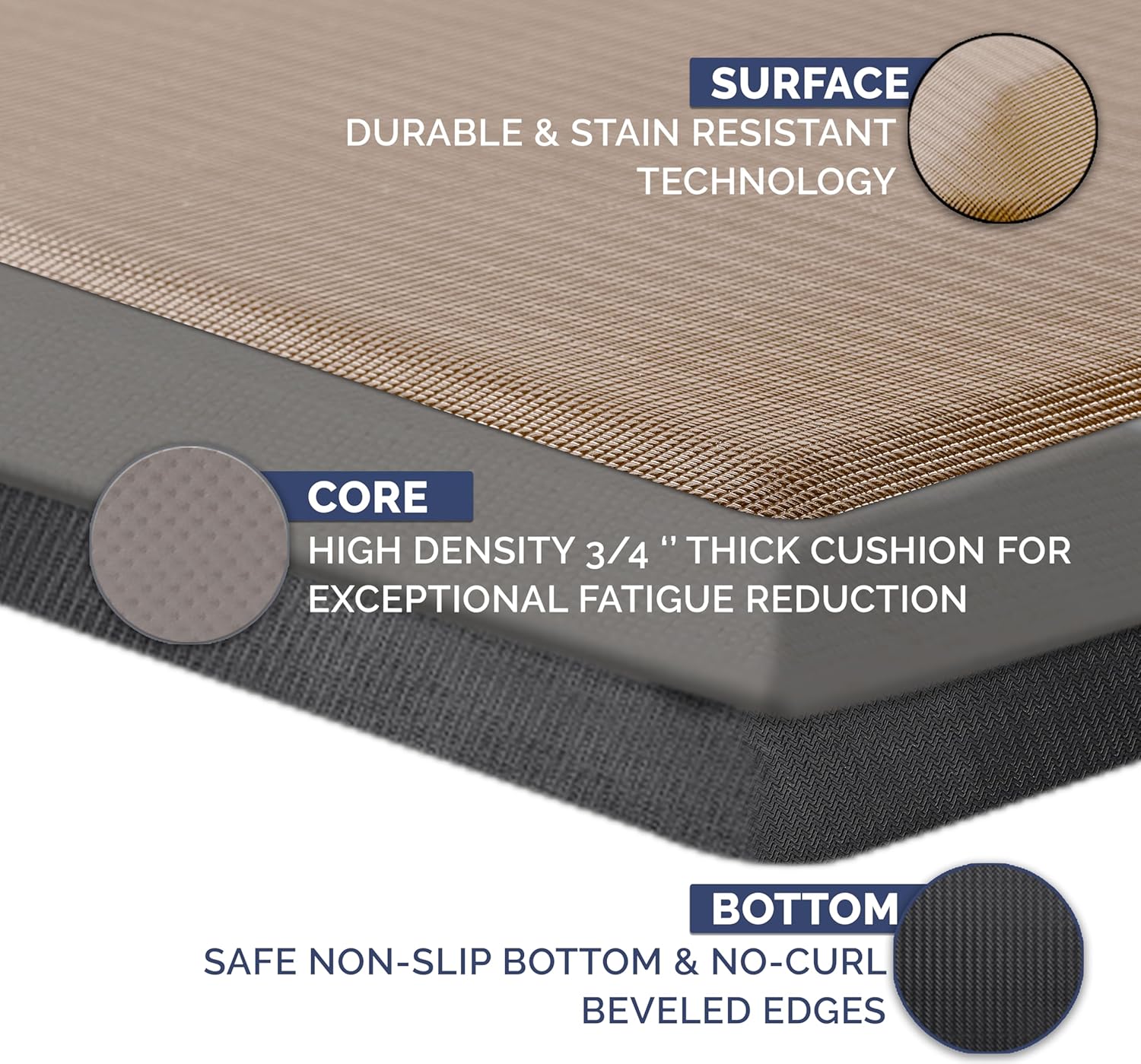 - Premium Quality Construction: The ComfiLife cushioned mat core is made of 3/4 thick, high-density memory foam that reduce discomfort on feet, knees, legs, and back while standing for an extended period. This kitchen mats cushioned anti-fatigue offers exceptional durability and long-lasting support. Perfect for high-traffic areas like the kitchen, office, or garage.