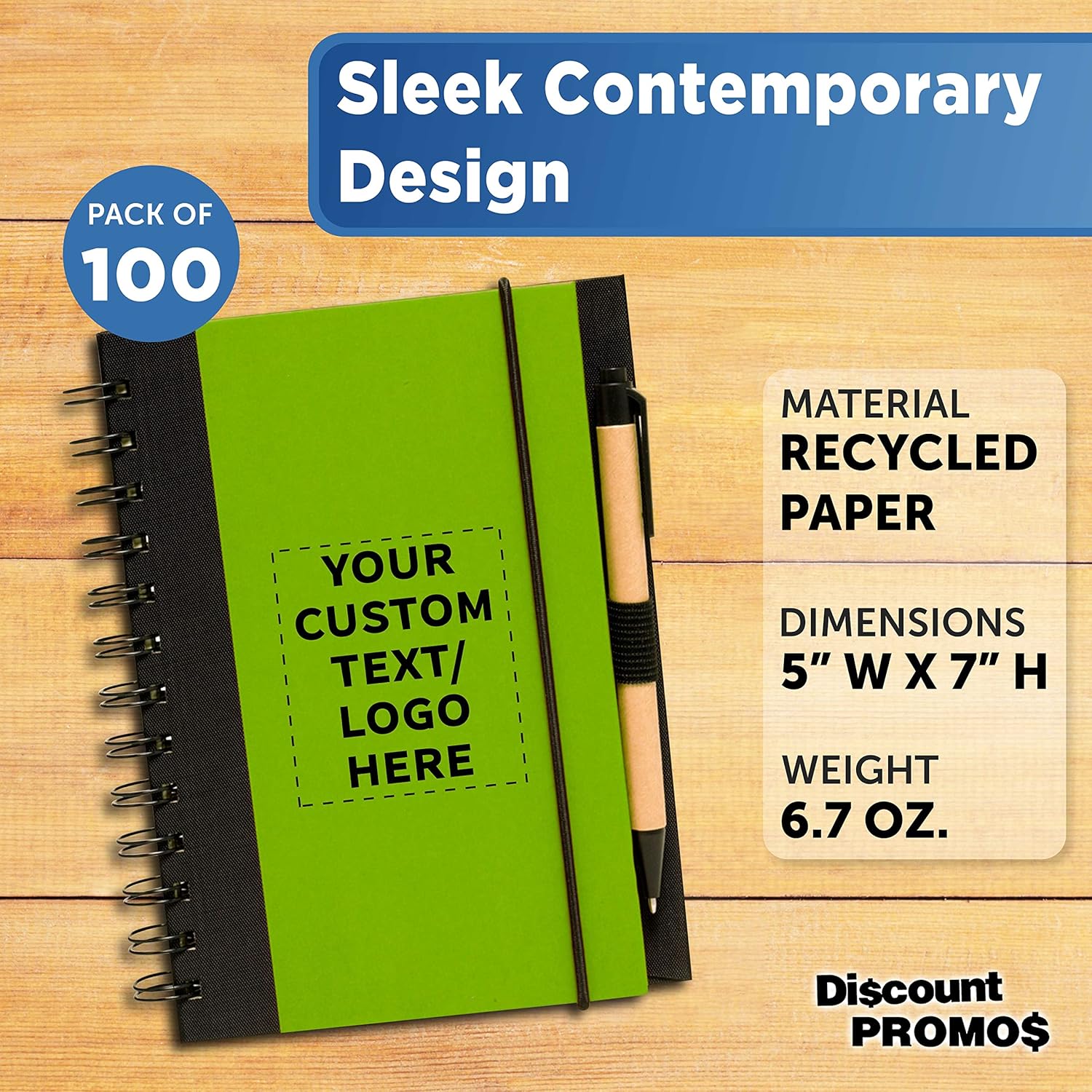 DISCOUNT PROMOS Custom Eco Block Notebooks with Pens Set of 100, Personalized Bulk Pack - Perfect for School, Office, Business, Home - Lime Green