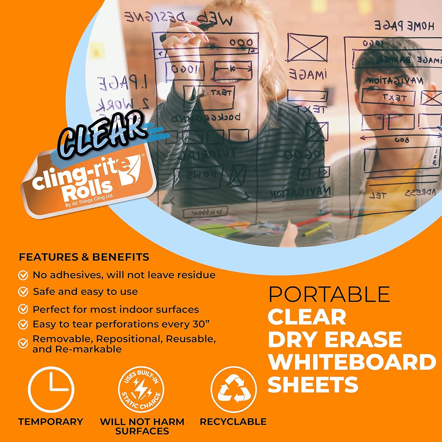 Clingers Clear Dry Erase Cling-rite Rolls - Removable, Recyclable Whiteboard Sheets, 20x30 Inch, 20 Clear Sheets for School, Office Decor, and Art Projects & Dry Erase Marker Included - American Made