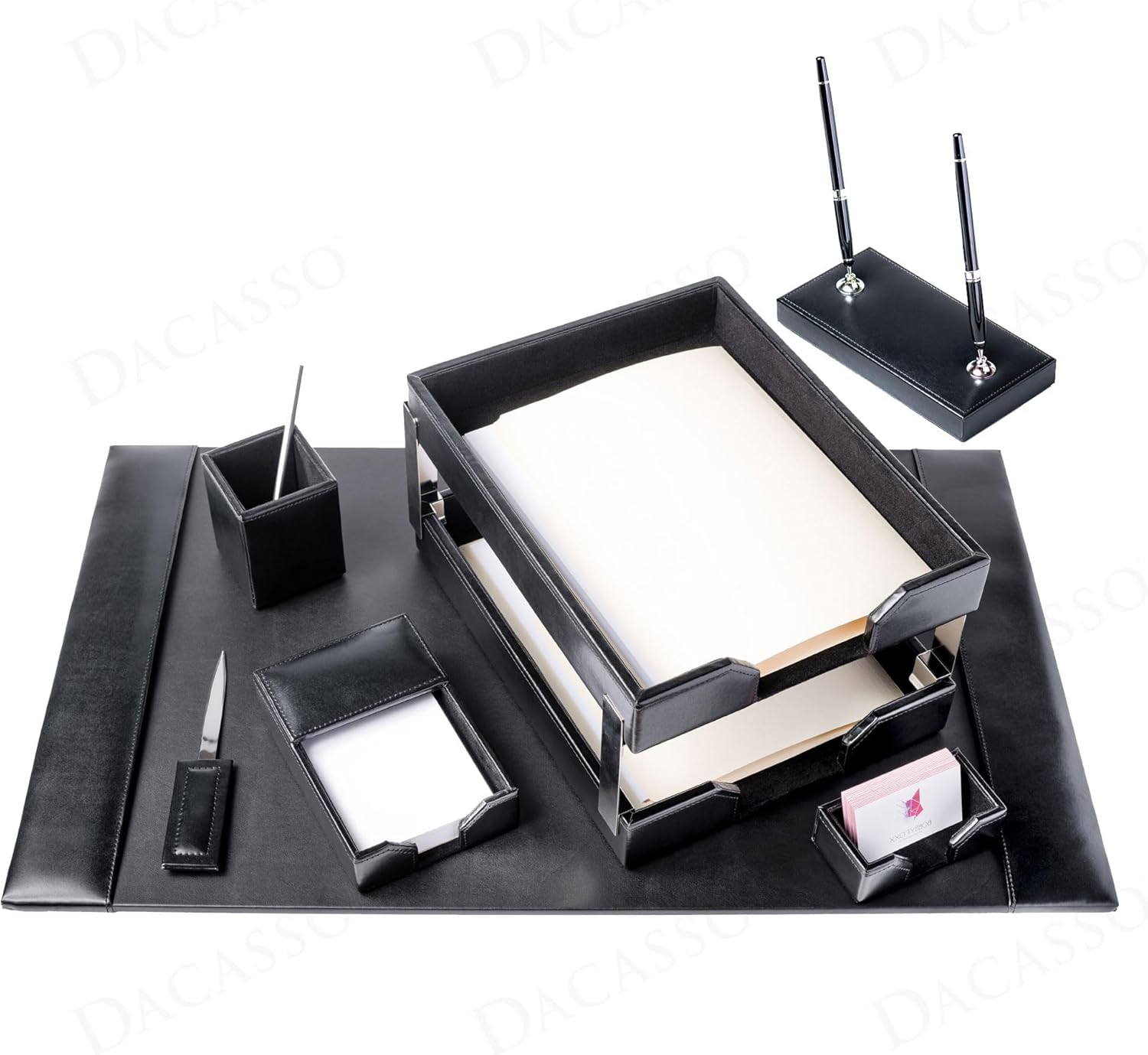 - CONTENTS: You'll get the popular 30" x 18" desk pad. It's complemented by a perfectly matching double letter tray set, double pen stand, pencil cup, memo holder, letter opener and business card holder.