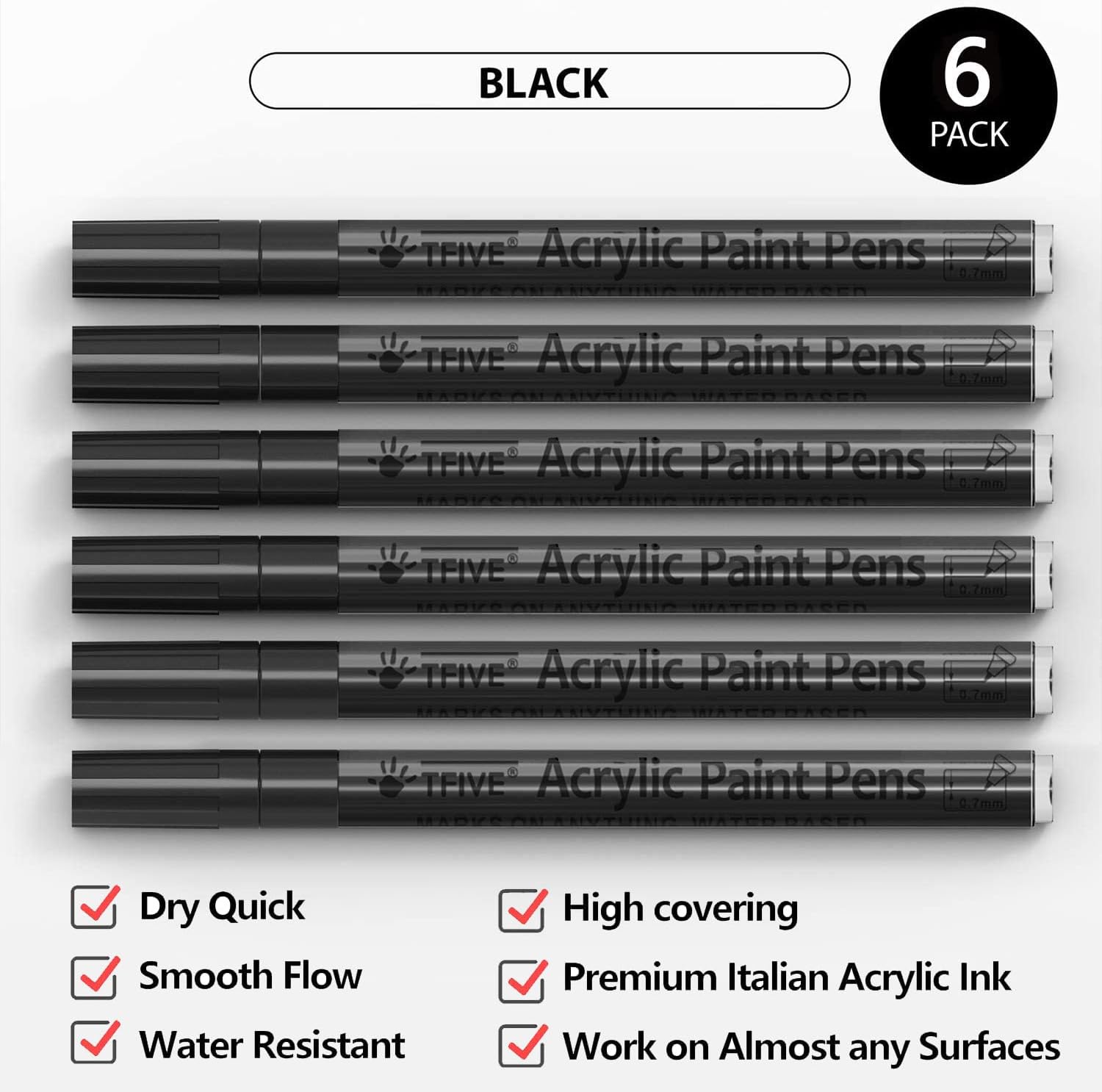 Black Marker Paint Pens - 6 Pack Acrylic Black Permanent Marker, 0.7mm Extra Fine Tip Paint Pen for Art projects, Drawing, Rock Painting, Stone, Ceramic, Glass, Wood, Plastic, Metal, Canvas DIY Crafts