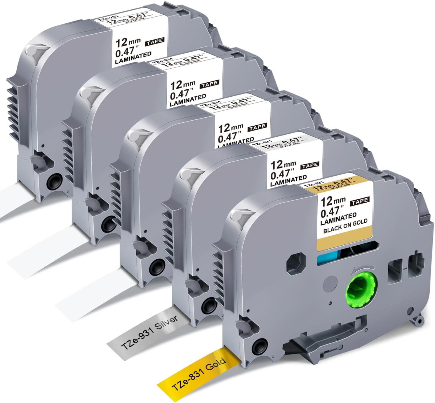 5-Pack Label Maker Tape 12mm 0.47 Inch Laminated White/Gold/Silver Muti-Color Replace for Brother TZe TZ Tape TZe-231 TZe-831 TZe-931 Compatible with Brother P-Touch PT- D210 D220 H110 D400AD