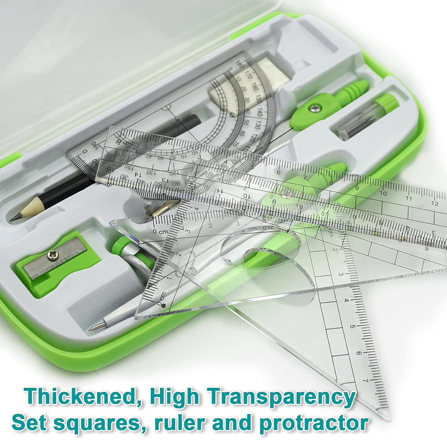 Geometry Compass Kit Starter Maths Set with 2 Drafting Compasses Protractor Set Squares Ruler and More for Students Maths Study, Green
