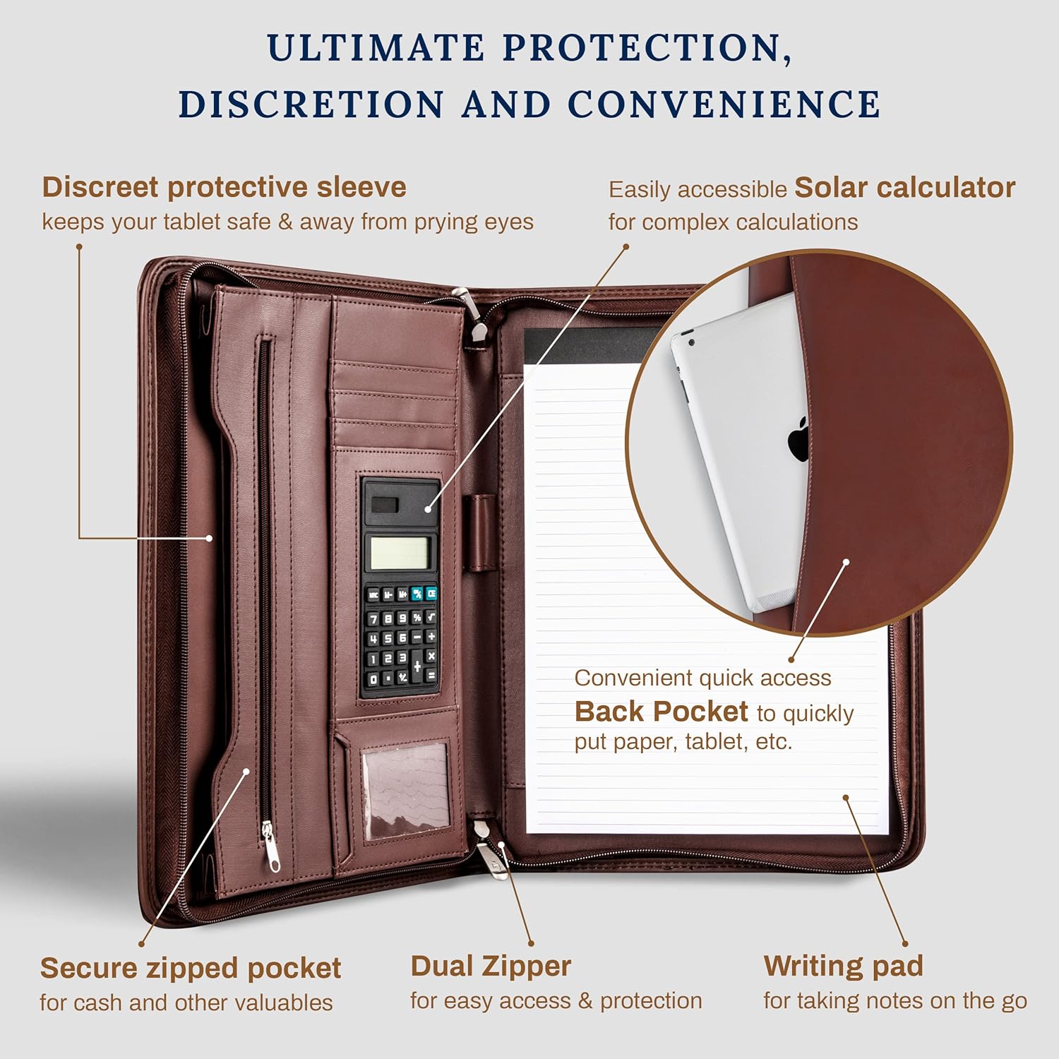 Cossini Premium Business Portfolio with Zipper – Padfolio - Superior Business Impressions Begin with PU Vegan Leather, 10.1 Inch Tablet Sleeve, Smart Storage, Solar Calculator, Writing Pad -Brown