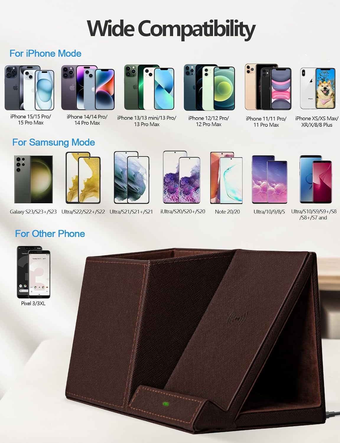 - ✎✎✎ Universal Compatibility of Wireless Charger: 7.5W fast charging for iPhone 17/16/15/14/14 Plus/14 Pro/14 Pro Max/13/13 Pro/13 Mini/13 Pro Max/12/SE 2020/11/XS/XR/X/8; 10W fast charging compatible for Samsung galaxy S24/S23 Ultra /S23/ S23+/S22 Ultra / S22 / S22+ / S21 Ultra /S21+ / S21/ S20 Ultra / S20/Note 10/S10/S10E and So on; (Note: Adapter is NOT Included)