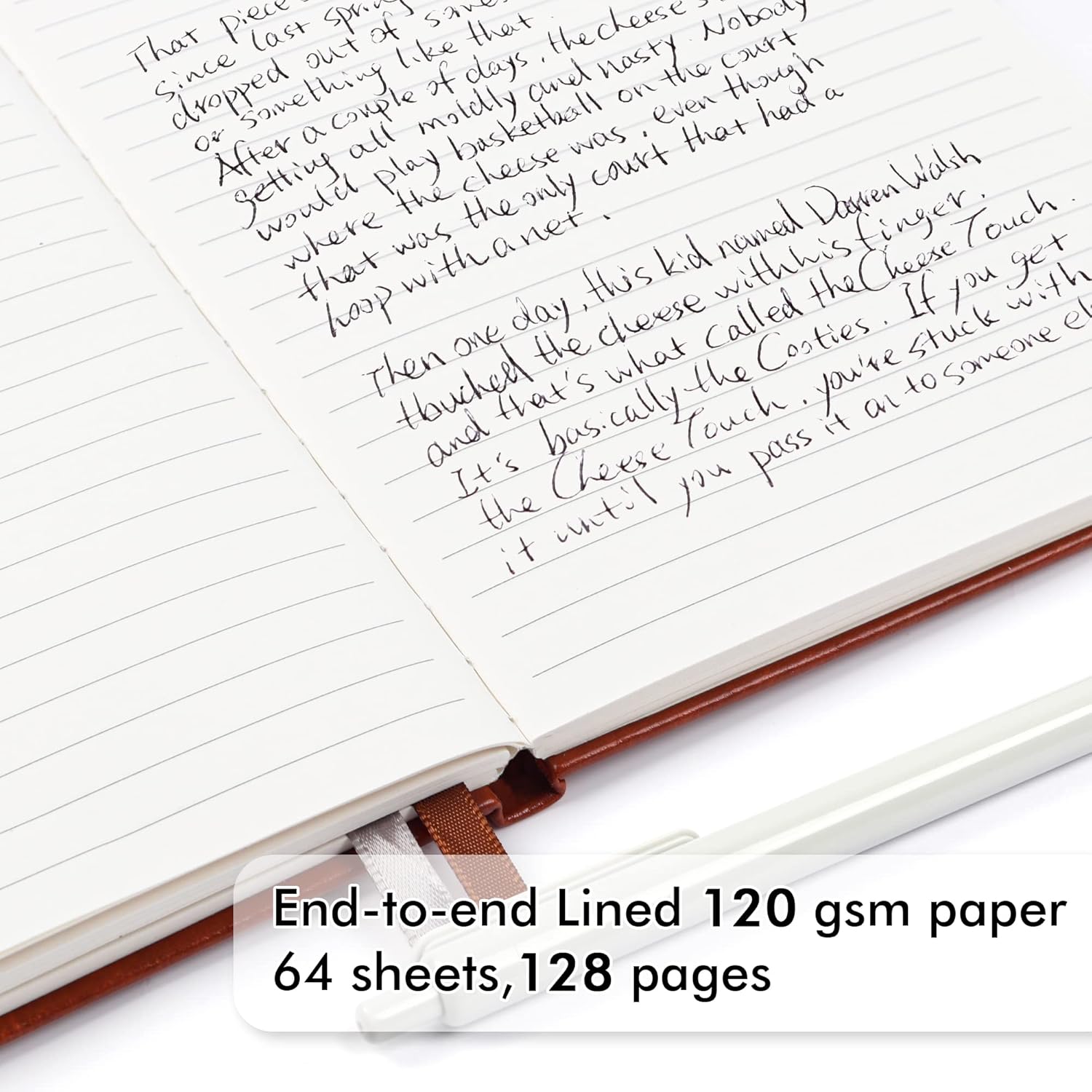 - These classic ruled notebooks are all blank inside with 128 lined pages (64 sheets), which would be convenient for daily usage. The hard cover journal has a water-resistant faux leather cover, round corners and bookmarks, which is designed to lay and open flat. There’s a “date/page” column on the top of every page. You can use it as a reminder to let you remember those important dates and find the page you want in a very short time.