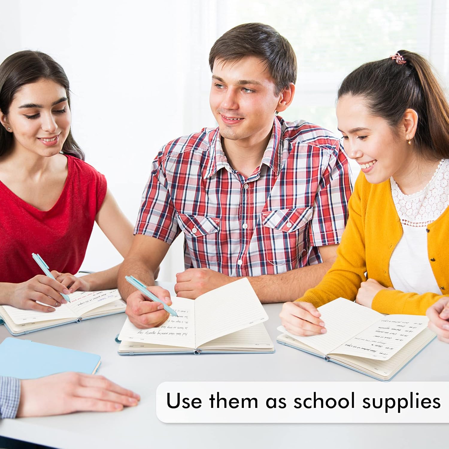 - Feela 24 Pack Classic Ruled Notebooks contains 24 classic light blue ruled sturdy cover notebooks and 24 Black Retractable Pens. Each of the notebooks measures 8.3” x 5.1”, which is perfect to carry and easily held by young girls and boys. These black cute pens are customized to be placed in the pen holder, which is pretty convenient.