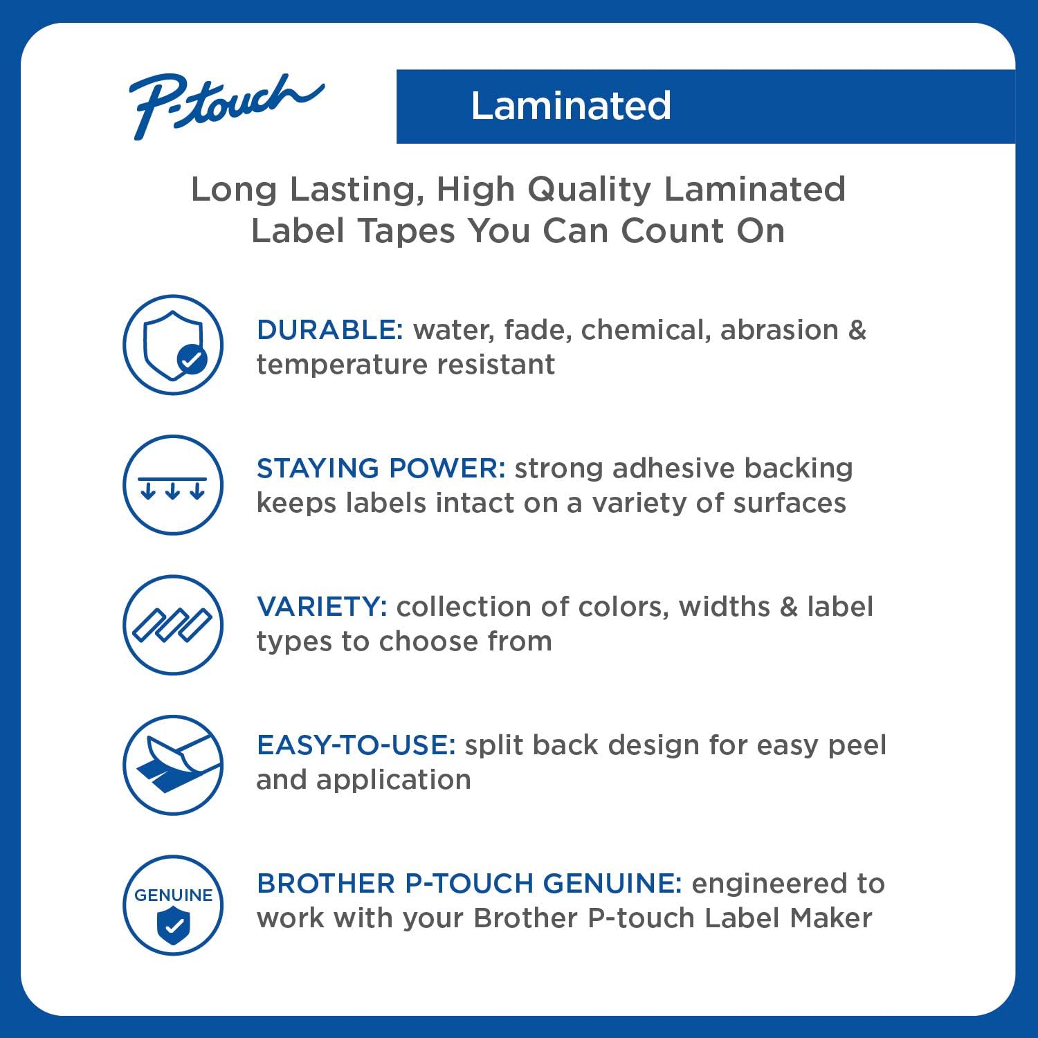 - EASY TO APPLY – P-touch tapes are designed with a sturdy laminated adhesive backing and an easy-to-clean laminated surface. The split-back design makes it easy to apply.