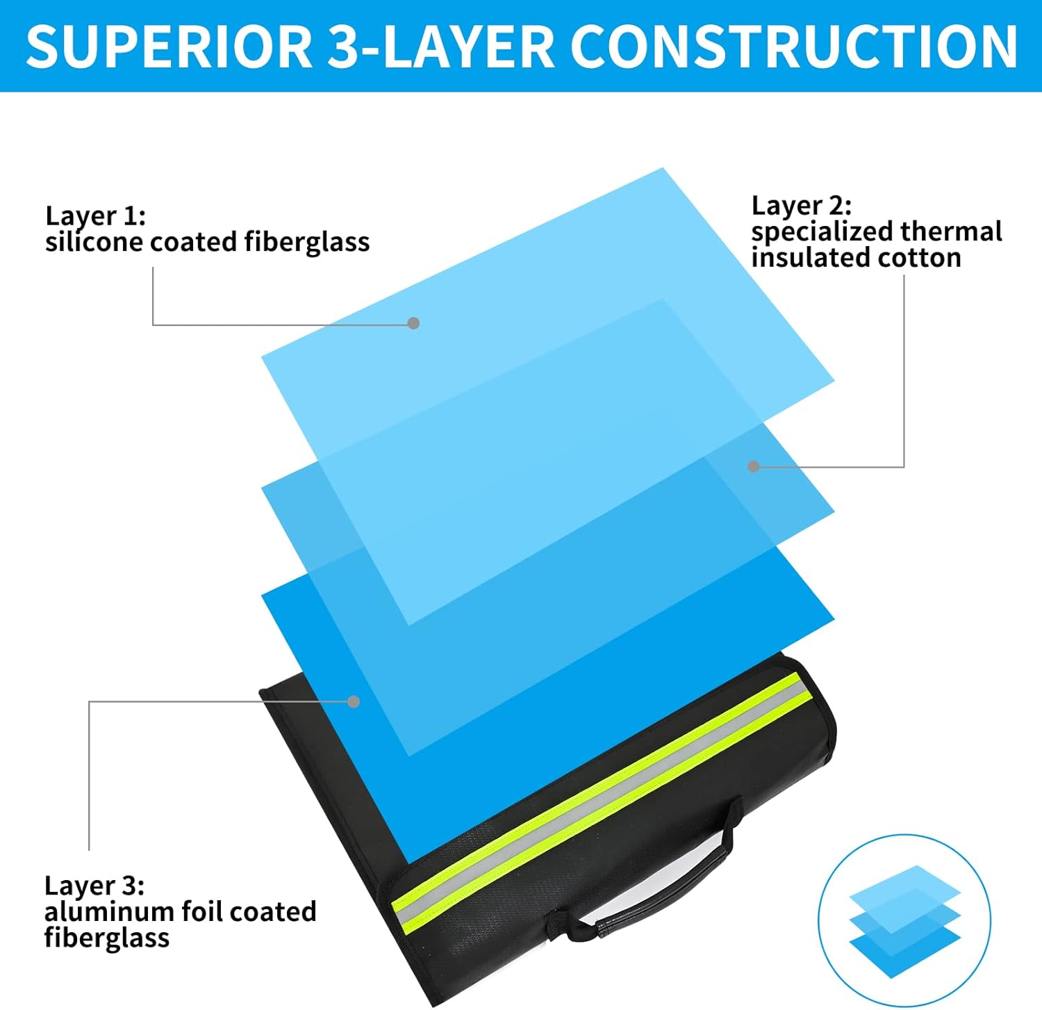 - THERMAL INSULATED + HIGHEST FIREPROOF RATING + WATER-RESISTANT: The fireproof waterproof document boxes can withstand heat up to 2000°F thanks to the hight quality silicone coated Non-Itchy fiberglass fabric. To further protect paper items, there is also a dedicated thermal insulation mid-layer as well as an aluminum foil coated interior. Additionally, the exterior is made of waterproof silicone which enables our fireproof document bags to survive the spray of water in most conditions.