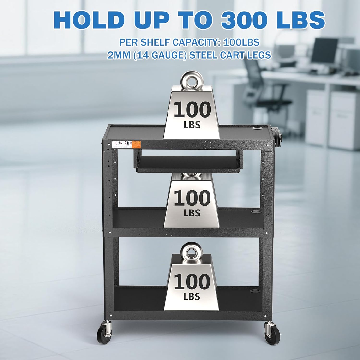 - SUPPORT UP TO 300 LBS: Constructed with 2mm (14 gauge) steel cart legs and heavy duty wheels, this utility cart features robust structure that can support up to 300 lbs (per shelf capacity is 100 lbs). Ideal to place computers, projectors, laptops, tablets, printers, monitors, audio, DVD, documents and so on for presentations, interactive teaching and collaborative work.