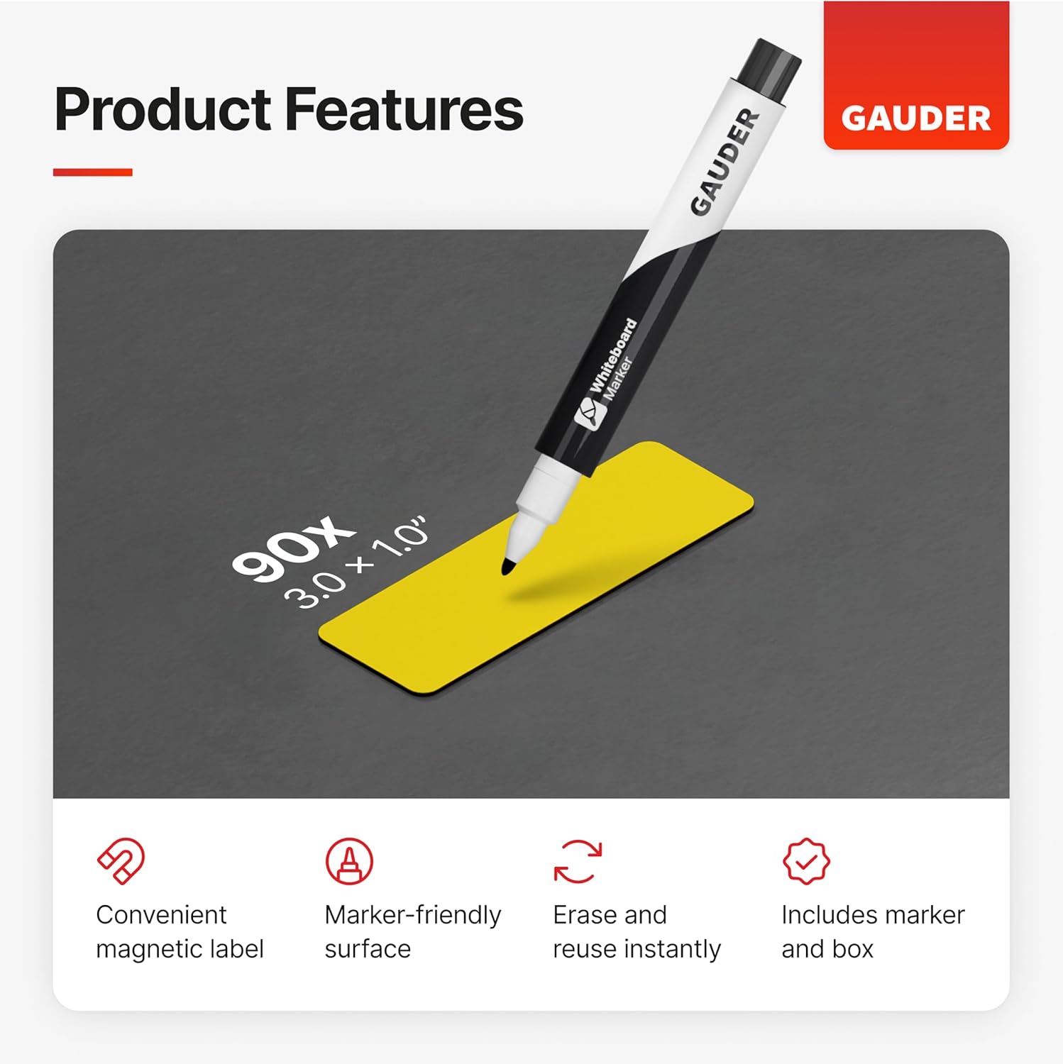 - REUSABLE AND SUSTAINABLE: GAUDER magnetic labels can be written on with the included whiteboard marker and reused repeatedly.