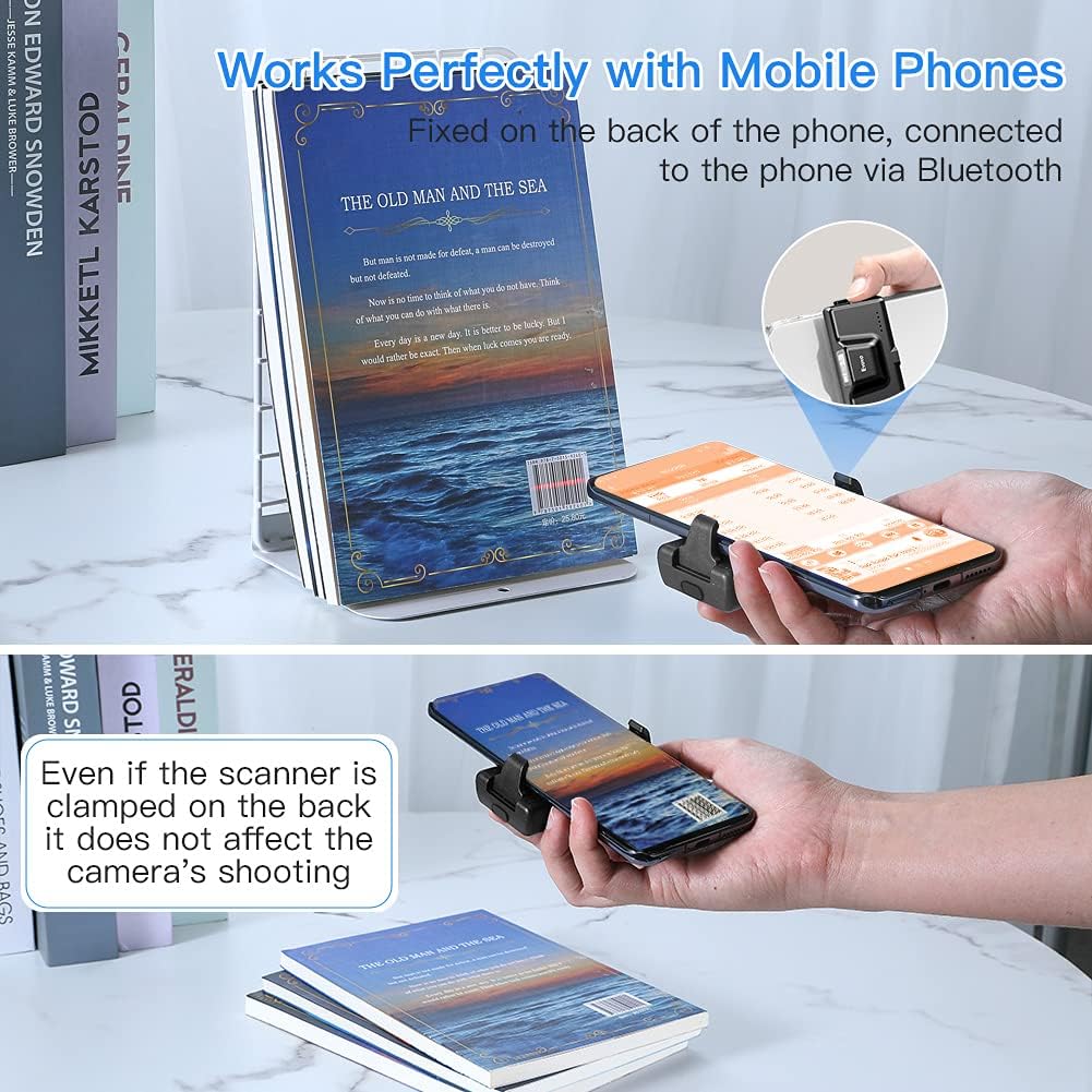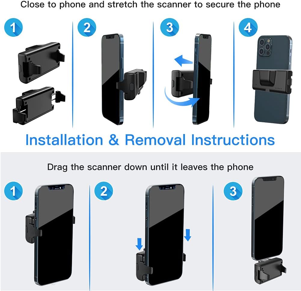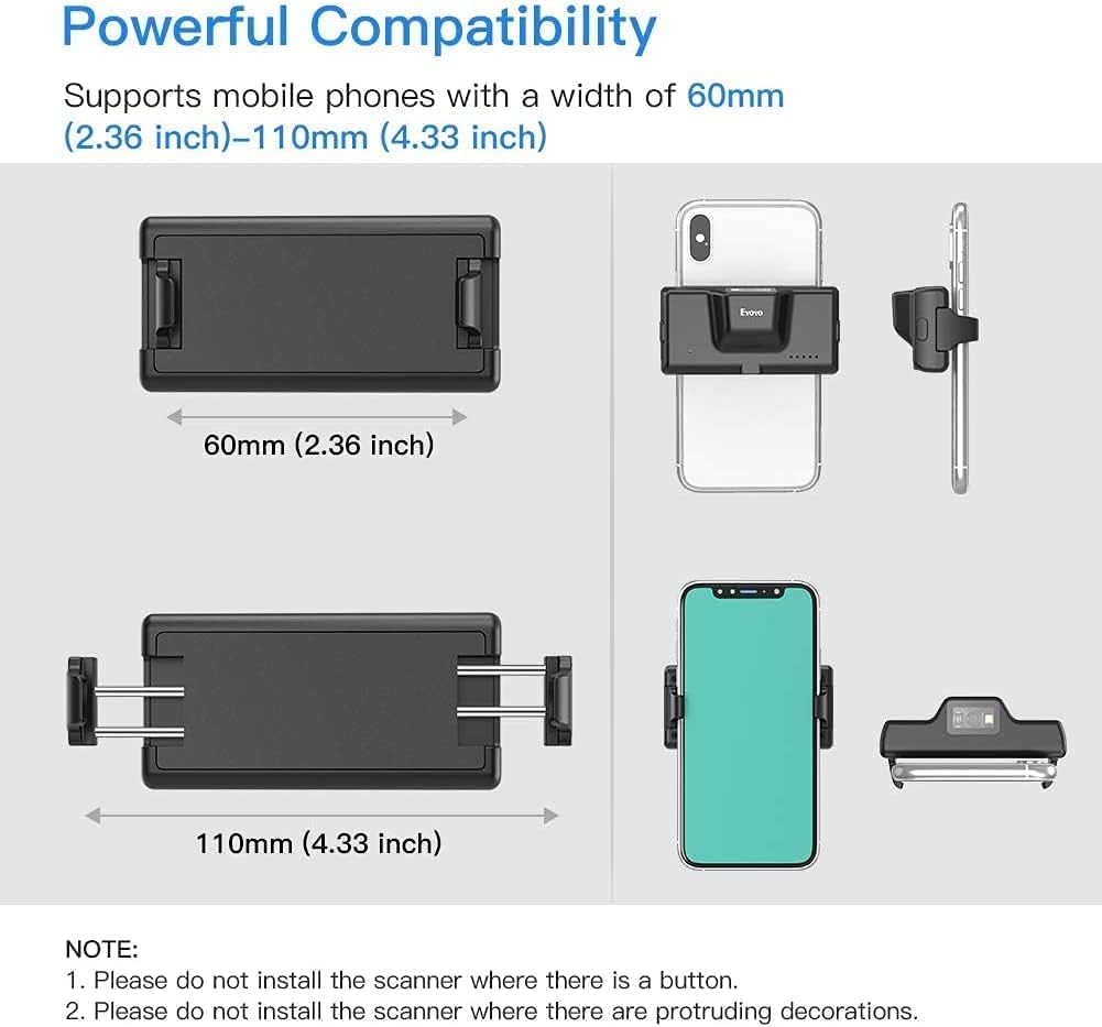- Phone Clip-on Design, Not Block Camera: When you often use the Scoutly and Scoutiq apps, then the Phone Clip-on barcode scanner is the best choice for you. It will not block the phone's back camera. It can work well with almost all the normal phones with a width of 60mm(2.36 inches) to 110mm(4.33 inches). (please note 1. Please do not install the scanner where there is a button 2. Please do not install the scanner where there are protruding decorations)