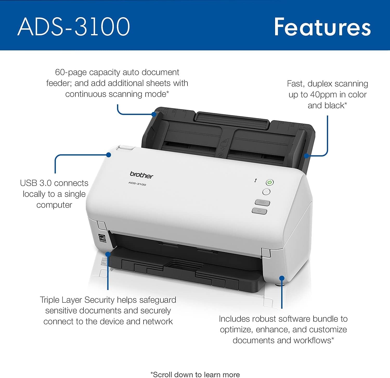 Brother ADS-3100 High-Speed Desktop Scanner | Compact with Scan Speeds of Up to 40ppm, White