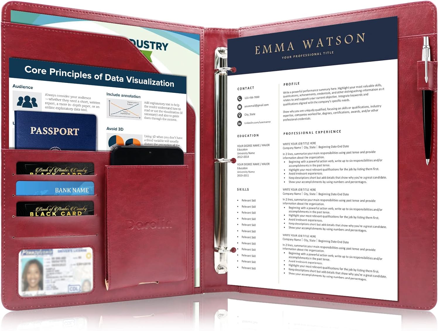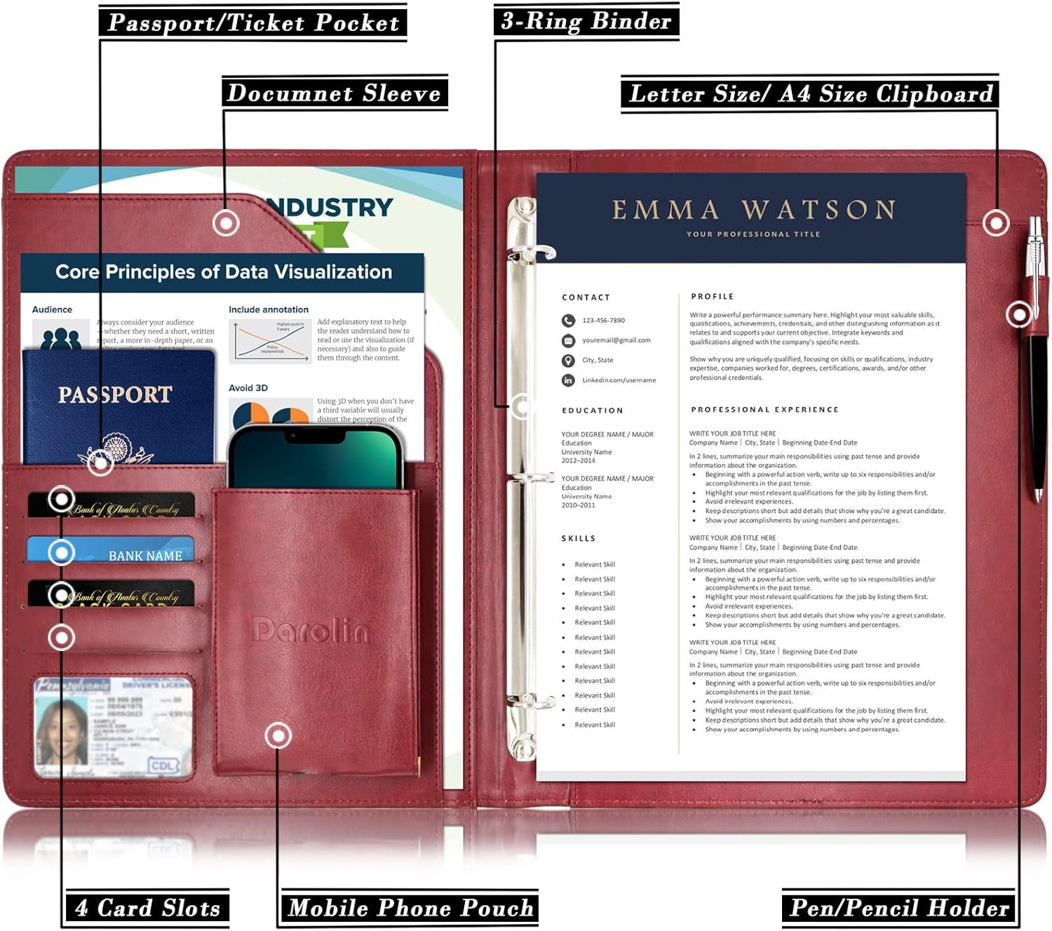 - [PRACTICAL & ORGANIZED] Darolin Portfolio Binder 3 Ring case designed with one Stainless Steel 3 Ring Binder, Pen Loop, Cell Phone Holder, File pocket, Bill Pocket and 4 Card Holders. Various inside pockets and slots capable of holding documents, letters, notes, envelopes, mobile phone, pens, business cards and other stuffs, which facilitate your daily use and business travels, make your work or study more efficient, which brings great convenience in daily life.