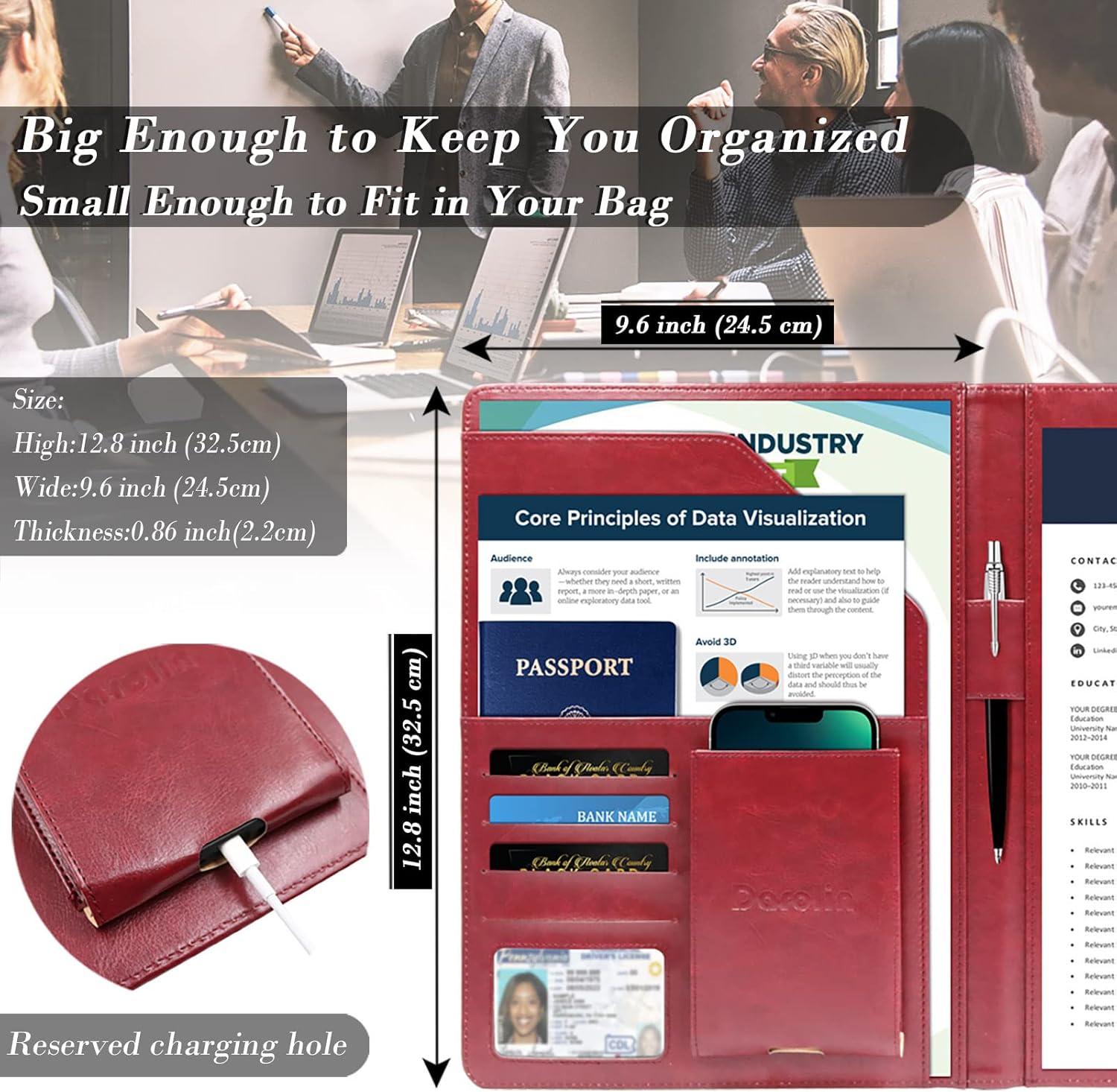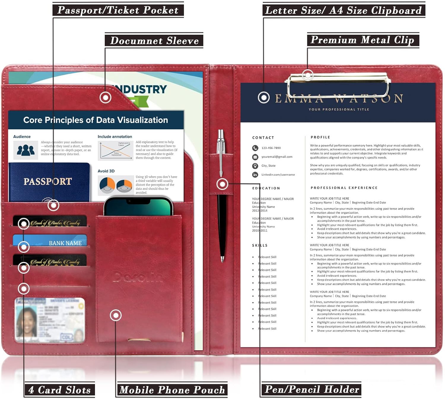 - [PRACTICAL & ORGANIZED] Darolin padfolio portfolio case designed with one metal clip, pen loop, cell phone holder, file pocket, bill pocket and 4 card holders. Various inside pockets and slots capable of holding documents, letters, notes, envelopes, mobile phone, pens, business cards and other stuffs, which facilitate your daily use and business travels, make your work or study more efficient.