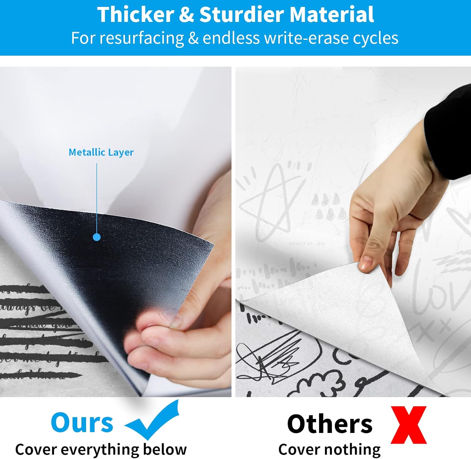 - THICK & STURDIER Dry Erase Wallpaper: This white board roll is made of premium material of high cost, it’s odor-free, non-toxic, and safe for even small hands to doodle on. Under the PET writing surface there is the metallic layer that thickens the dry erase decal with strong covering power, helps block light and completely covers the graffiti on wall, and improves writing experience by letting you feel like writing on a true dry erase board instead of on a wall.
