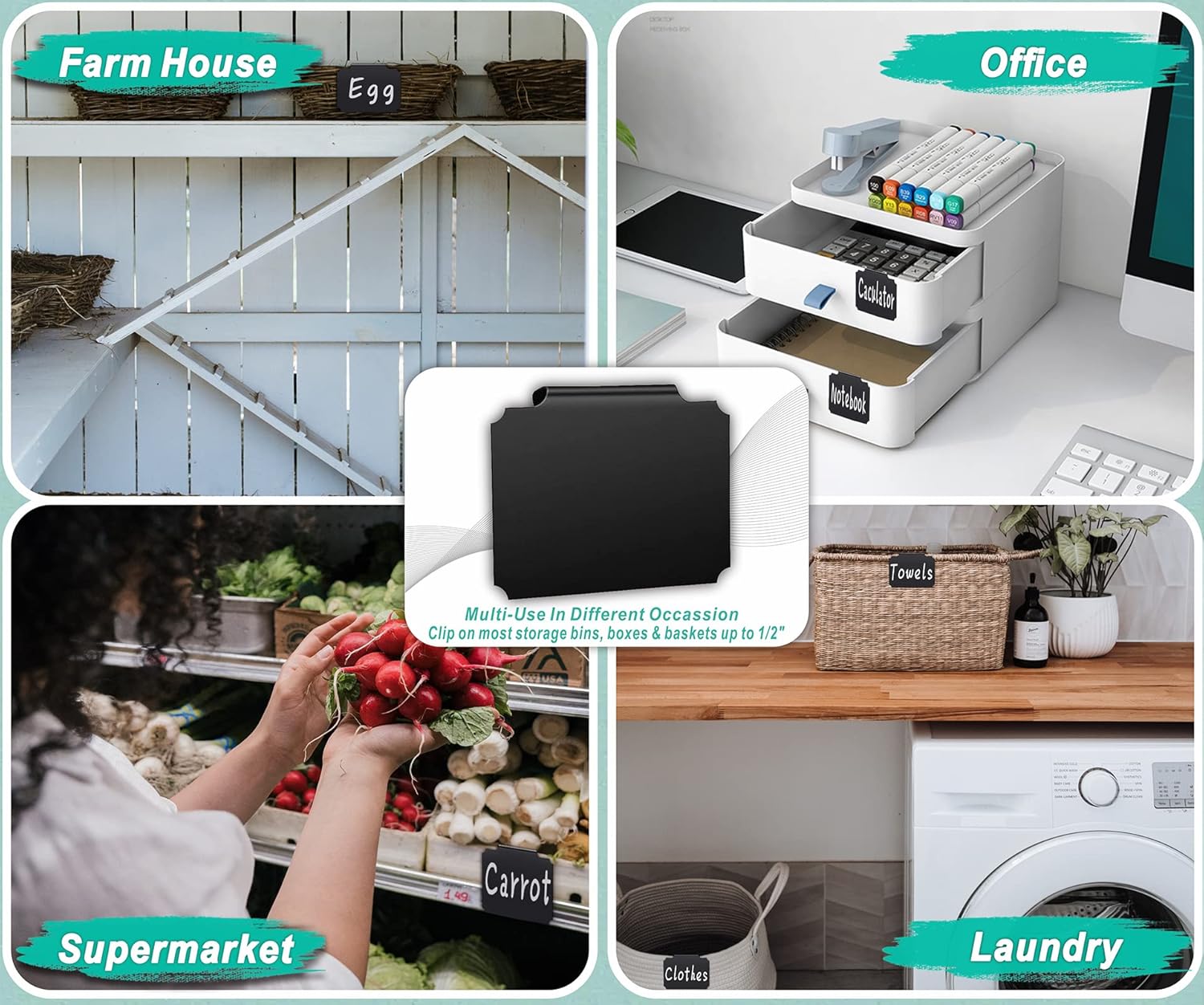 - 【Appropriate Size & Smart Clip-on Design】- Our storage bin labels are 3.54"L x 2.76"W. The eye-catching and unique clip-on design makes it much easier to tightly clip on most edges like storage bins,baskets, boxes and drawers. Meanwhile it's removable, repositionable and erasable if you want it anytime and anywhere.