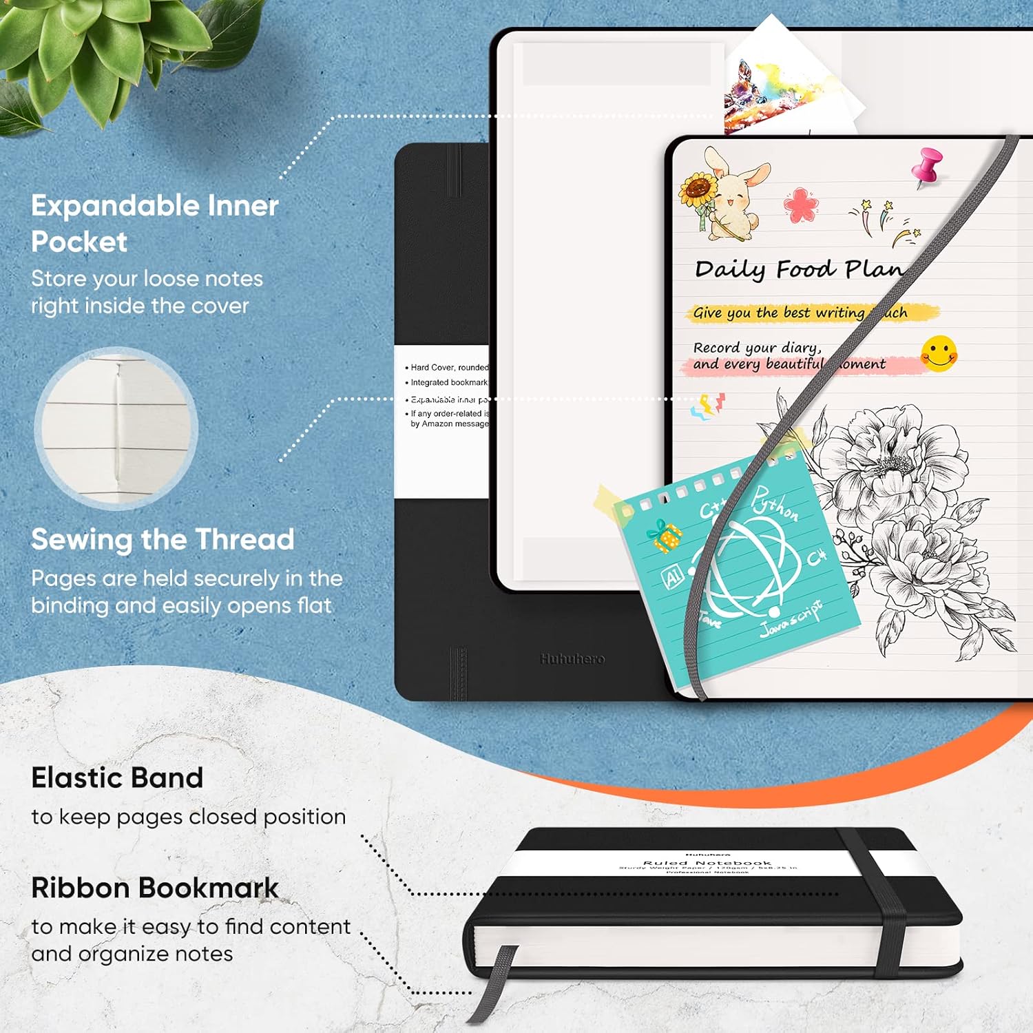 - Expandable Pocket + Elastic Closure Band+ 1 Ribbon Bookmark - The elastic band is strong and the page marker comes in handy. It has a handy-dandy pocket in the back to keep business cards, notes, receipts and other small paper items. Huhuhero notebook will provide perfect writing experience, great for bullet jounaling, studying, journaling, note taking, daily planning, drawing. Premium college supplies, office supplies, art supplies.