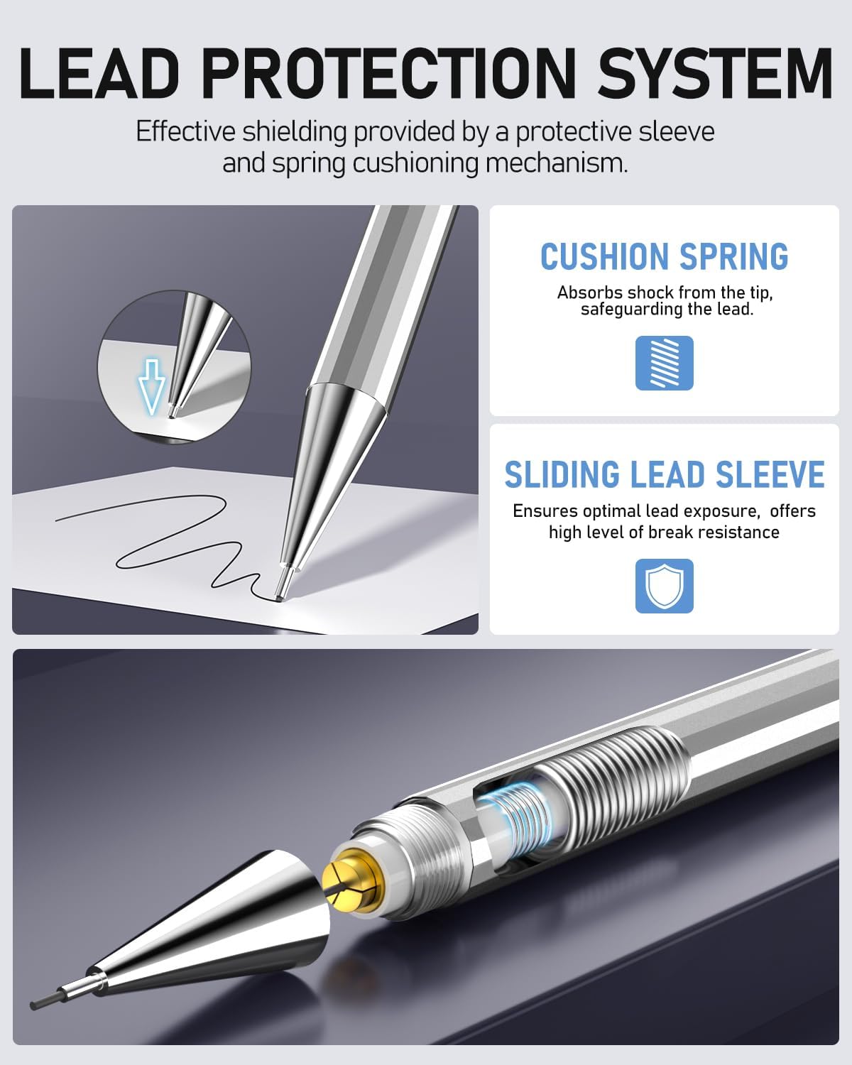 - Metal Mechanical Pencil: The smooth barrel of the mechanical writing pencil has a comfortable feel, and the metal body provides the ideal weight balance for more efficient and fatigue-free writing and drawing