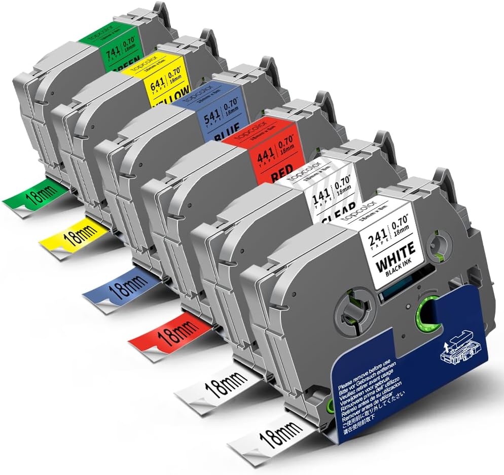 - Package Content: 6 Pack 18mm 0.7" laminated tape compatible with Brother ptouch tape 18mm 0.7 tz-141 tz-241 tz-441 tz-541 tz-641 tz-741 tze tz tape 18mm 3/4" label maker refills; Size: 0.7 inch x 26.24 feet ( 18mm x 8m ). Color: Black on Clear/White/Red/Blue/Yellow/Green