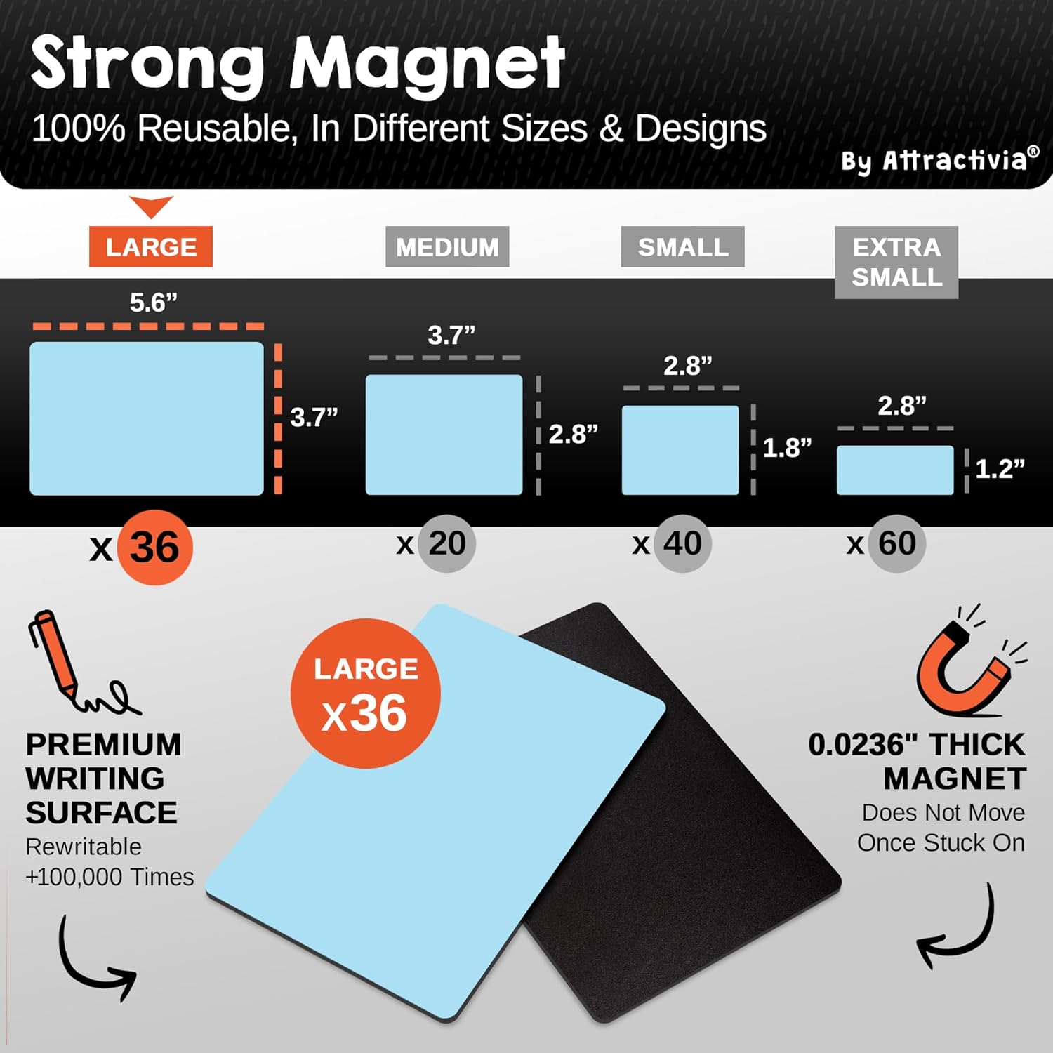 - Strong Magnetic Hold: Our dry erase magnets feature a powerful 0.02 inch thick magnetic back for instant and secure adhesion to any metallic surface, whether flat or slightly curved. Easily attach our dry erase stickers labels and remove without residue, ensuring a firm grip even on rounded surfaces.