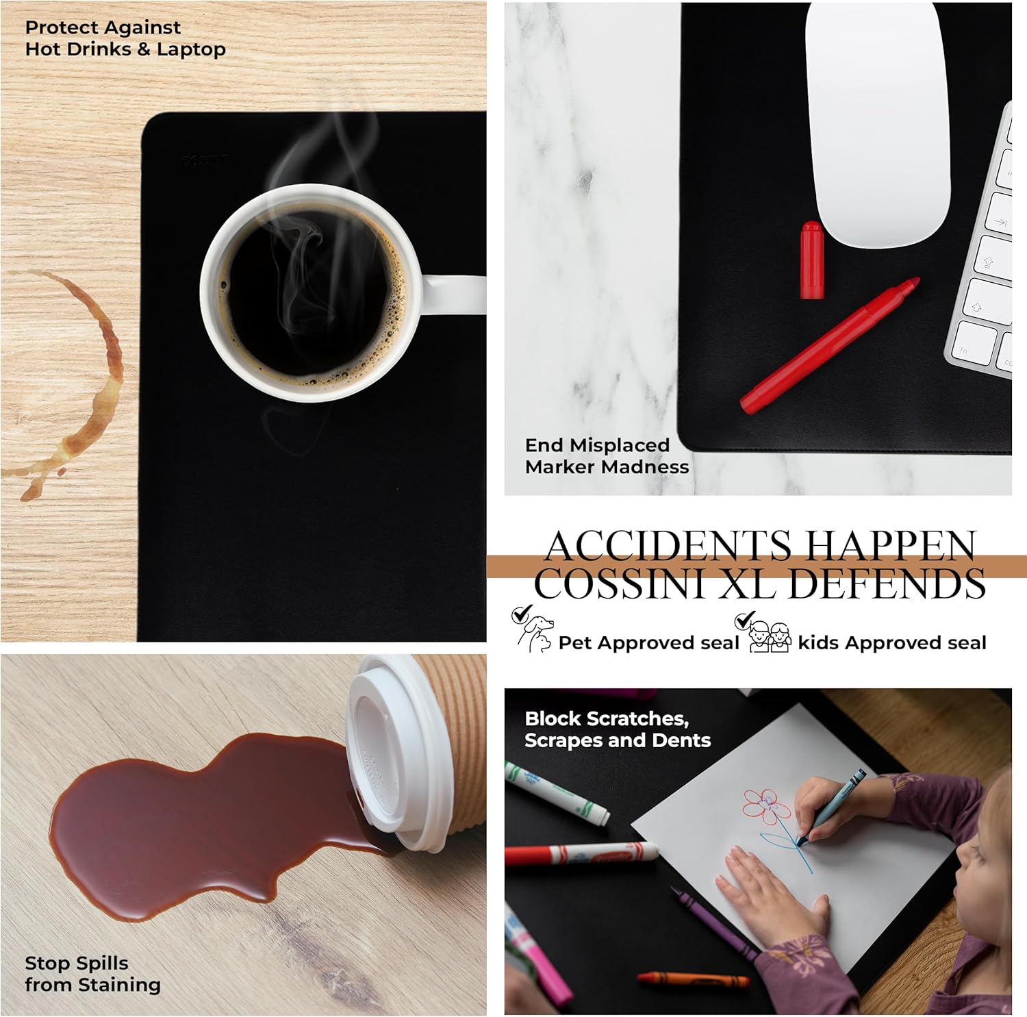 - Oops! Block kid, pet & you damage: heat. Spills. Stains. Scratches. Coffee cup rings, moisture, water, drinks, ink, dirt, scuffs, and even your clients crazy toddlers can’t inflict damage on your stunning wood or glass desk, making this desk pad large waterproof surface an ideal replacement for a large mouse pad for desk, computer mat, or traditional leather desk pad for keyboard and mouse in kid and pet accessible areas.