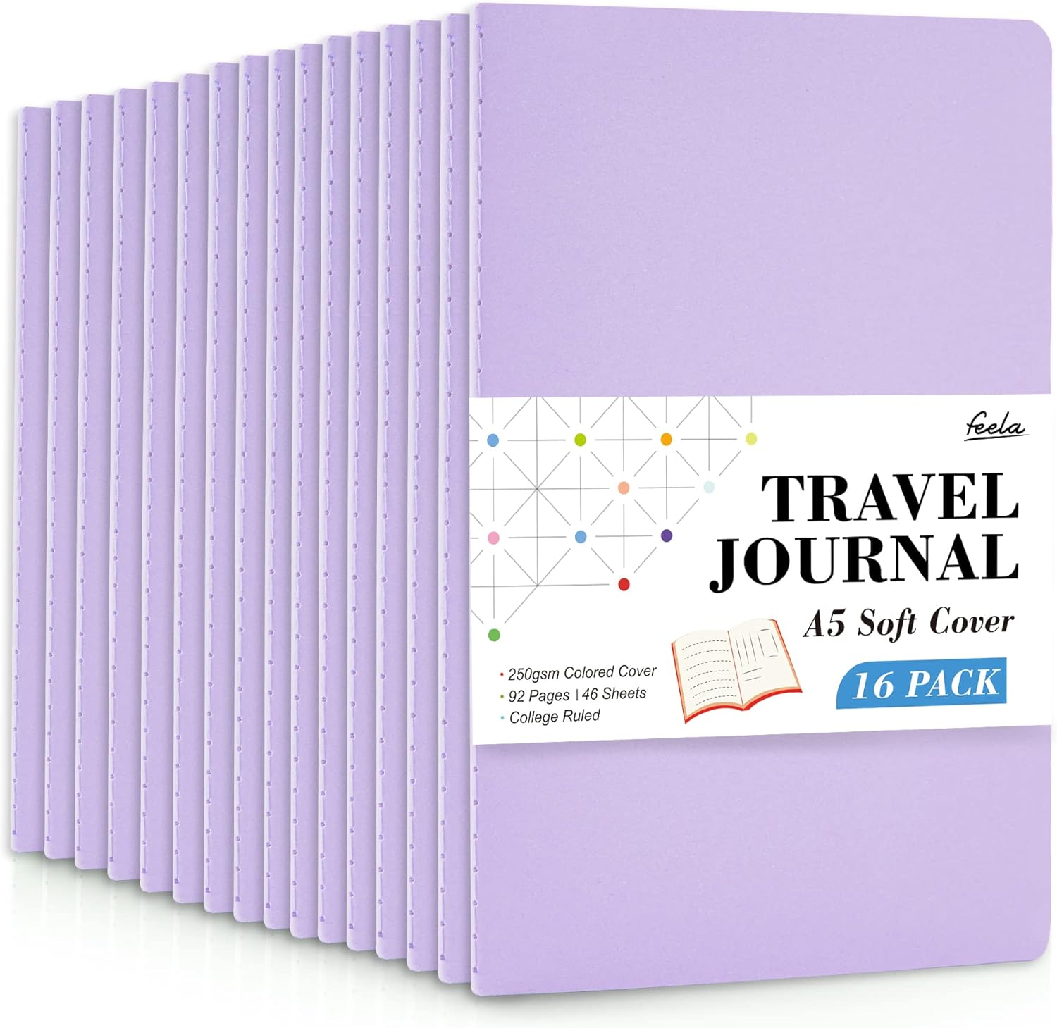 - Feela 16 Pack Soft Cover Journals include 16 light purple A5 college ruled soft cover travel journals. 250 GSM colored paper cover outside and 80 GSM smooth writing lined pages inside.