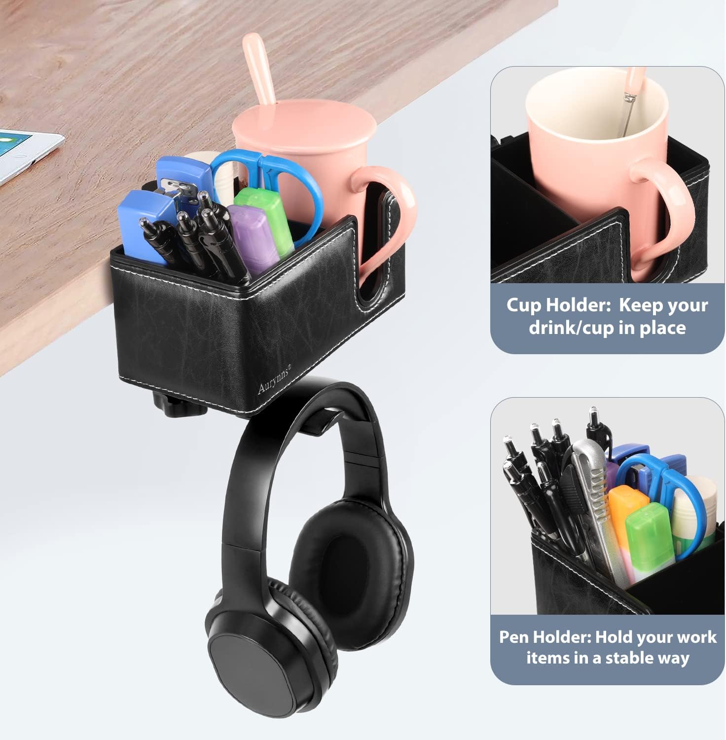 - 【Multifunctional Desk Organizer】: 3-in-1 Clamp Extender Desk Organizer: Desk Cup Holder, Pen Holder, Headphone Hanger. It can save more space for your desk, and keep tidy.